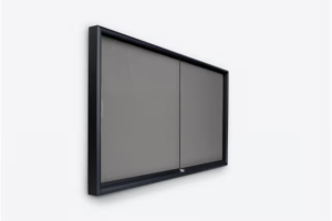 72 x 36 Enclosed Bulletin Board w/ Sliding Doors, Locking – Black with Gray Fabric