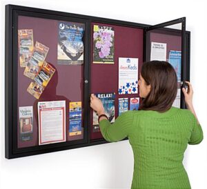 These fabric covered bulletin boards are a great way to deliver messages to everyone. Notice tackboards help to keep the community aware and informed about what is going on or upcoming events. These aluminum frame notice displays, fabric covered bulletin boards are made with a tackable surface covered in fabric. Unlike other traditional corkboard, this tackboard hides pin holes and will not crumble or fade. That makes these fabric covered bulletin boards that lock an ideal message center for a lifetime of use. Each unit features (3) spacious, panels for displaying plenty of messages. These fabric covered bulletin boards that have a cloth wrapped backboard accept thumb tacks or push pins. Businesses can use the enclosed corkboards to show schedules, announcements, posters, menus, advertisements and messages. These enclosed fabric covered bulletin boards, also called classroom corkboards, can be found in common areas, meeting rooms, banks, churches, hospitals, offices, universities and community centers as well.