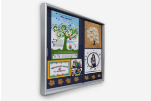 These 6′ by 4′ display bulletin boards are an effective way to communicate with guests and visitors in a popular location. Photos, postings, and memos tacked to this classroom fixture will surely get noticed by everyone who walks by. Display bulletin boards with fabric backing are designed with a quality aluminum frame with a silver finish. The durable material and construction makes this fabric tackboard ideal for high traffic areas. All display bulletin boards with rolling guides can be mounted in locations such as a school entrance, a library foyer, or town hall. Display bulletin boards have ample space for posting a large amount of information. This large pinboard can hold several poster sized photos and prints whether in a school, library, office, or lobby. All display bulletin boards include tempered glass doors. These doors are designed with rolling guides for easy use and access. Users can easily glide the doors closed and open. These wall mount display bulletin boards are the optimal way to post current information, school photos, library hours, and any other media in a busy location.