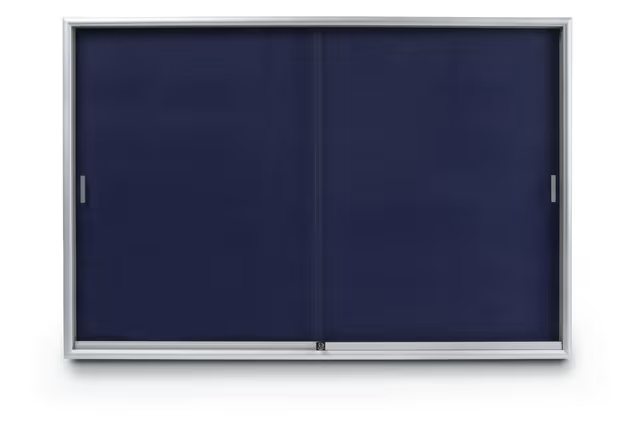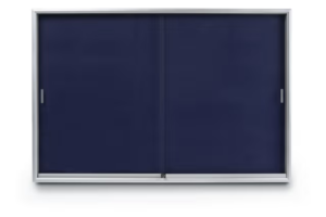 72 x 48 Enclosed Bulletin Board w/ Sliding Doors, Locking – Silver with Blue Fabric