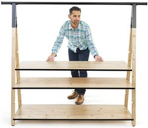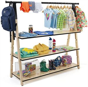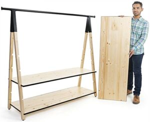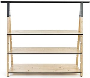 Our durable wooden a frame clothing rack with base shelves is a contemporary display solution perfect for retail stores, trade shows, showrooms and any space that is short on storage. This two-tone garment fixture features a minimalist design with three 50” W x 20” D adjustable shelves, making it easy to hang clothing while the lower shelves house folded apparel, shoes, accessories, and more. These wooden a frame clothing racks with base shelves increase storage potential with an extended hang rail for hats or bags. Each garment display has four shelving notches embedded into its frame, enabling quick adjustments to better suit the height and size of the merchandise displayed. Crafted from black powder coated metal and natural pine wood this two-tone, easy to assemble clothing display adds a minimalist contemporary feel that blends effortlessly into your space. Stage this durable wooden a frame clothing rack with base shelves in your location to create a visually appealing showcase for your customers.