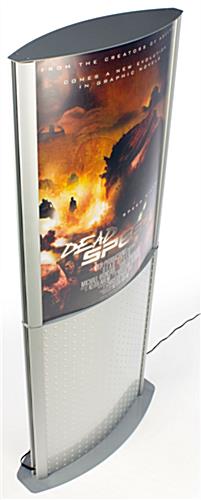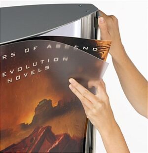 This sign holder features innovative LED lighting to illuminate your signs and posters. Great for lobbies and entrance ways, this illuminated poster stand holds two 24″ x 36″ sized graphics back-to-back. Posters are inserted using the convenient snap-open frames, and are covered by clear plastic lenses. Each illuminated poster stand also features a durable construction of anodized and powder coated aluminum. The base, center plate and top plate have a silver powder coated finish, while the snap frame has an anodized finish. We sell this illuminated poster stand with decorative printed silver square posters which may be removed to provide additional poster space (not illuminated).
