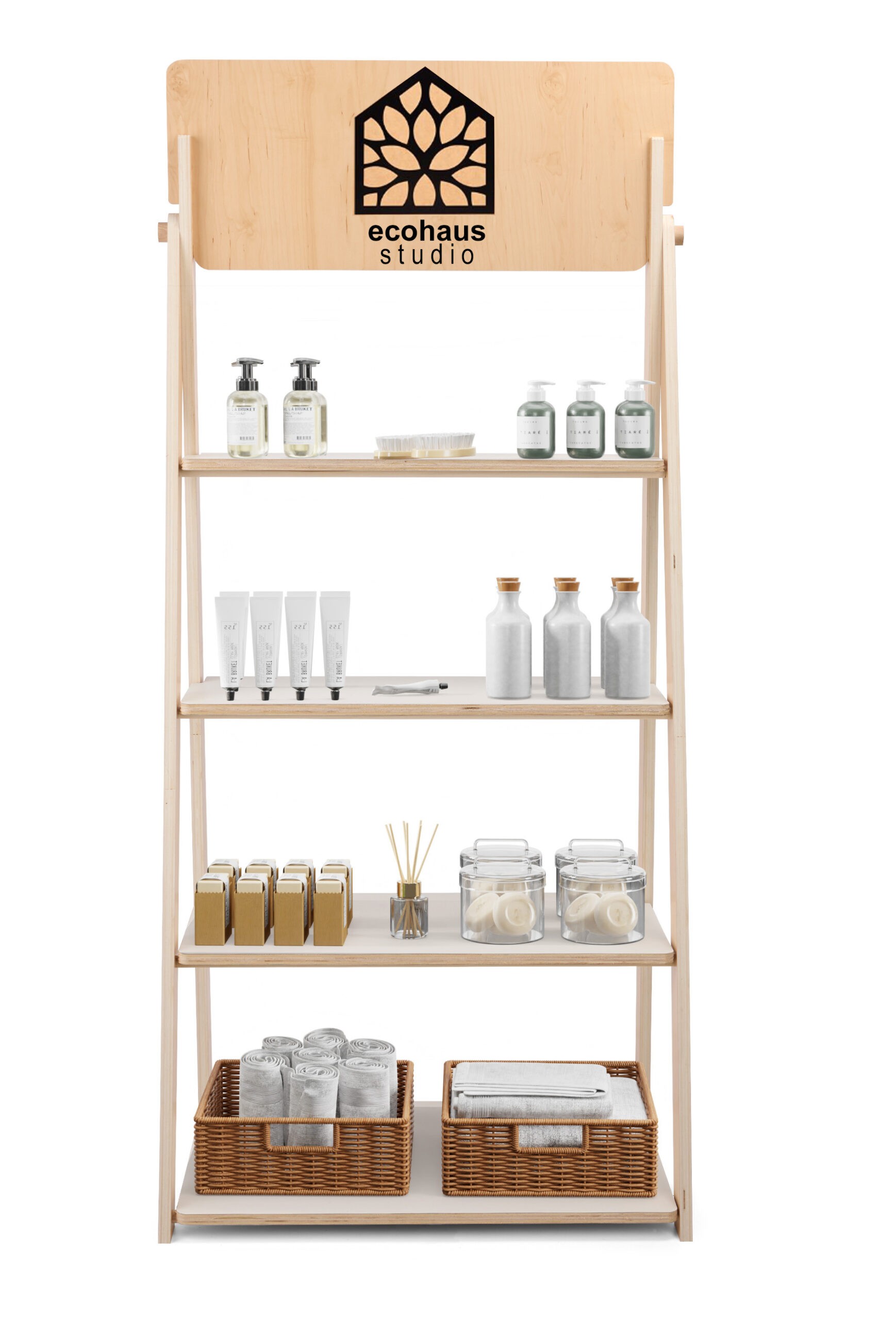 Our wooden ladder shelves with logo are a great decorative and functional addition to any retail store, boutique, spa, and more. Customize your display with your company’s branding to accentuate the effect this display has on your customers. This 4-tier shelving unit is built with a slanted design to assist with organizing a wide range of merchandise. With a 14″ gap between each platform, our wooden ladder shelves are perfect for storing beauty products, cleaning supplies, and other consumer items. Due to its UV-coated plywood and stainless steel screws, the slanted construction will withstand the wear and tear of any busy retail store. With an included 5/32 Allen key, you can quickly and easily assemble our decorative, 4-tier, knock-down unit. This gorgeous angled unit, like most of our Dandelion collection, comes in eco-friendly packaging, making it environmentally safe. For your boutique, retail store, spa, and more mix and match these knock-down wooden ladder shelves with our selection of dandelion products.
