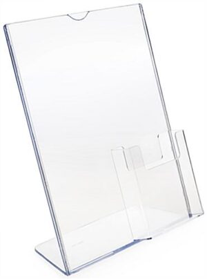 This molded plastic sign display has a front pocket for your flyers and brochures. This signage frame, like many inexpensive picture holders, is used to advertise both signs and leaflets. This plastic sign display with pockets is popular in high traffic environments and for large scale promotional rollouts. Each frame has a convenient top loading slot for easy insertion of your graphics. Simply slide an 8.5″w x 11″h advertisement from your printer into and out of the frame using the convenient thumb notch. This plastic sign display is a cheaper version of our upscale, deluxe line of acrylic frame. This cheap molded frame has been injection molded versus hand fabricated; the material used is a cheaper polystyrene and not optically clear acrylic. This plastic sign display has a slightly blue-ish tint to it and is thinner gauge (thickness) than our deluxe line. Although not equivalent to the deluxe line it is still a very functional unit for advertising graphic prints and dispensing literature.