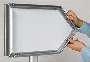 The directory sign is a lobby display that is easy to use! It can be assembled in minutes using only a screwdriver. Changing messages in the lobby sign is also effortless and requires no tools. Simply lift the sides, top, and bottom of the frame, insert your message, and snap close. The sign holder of the lobby stand is designed to hold a standard 8 ½” x 11″ sign, poster or printed graphic, and contains a clear plastic lens to protect your message. It can also hold an 8 ½” x 14″ sheet that is cut to fit the arrow shape of the sign. The lobby display can be used with one or both sides showing messages.