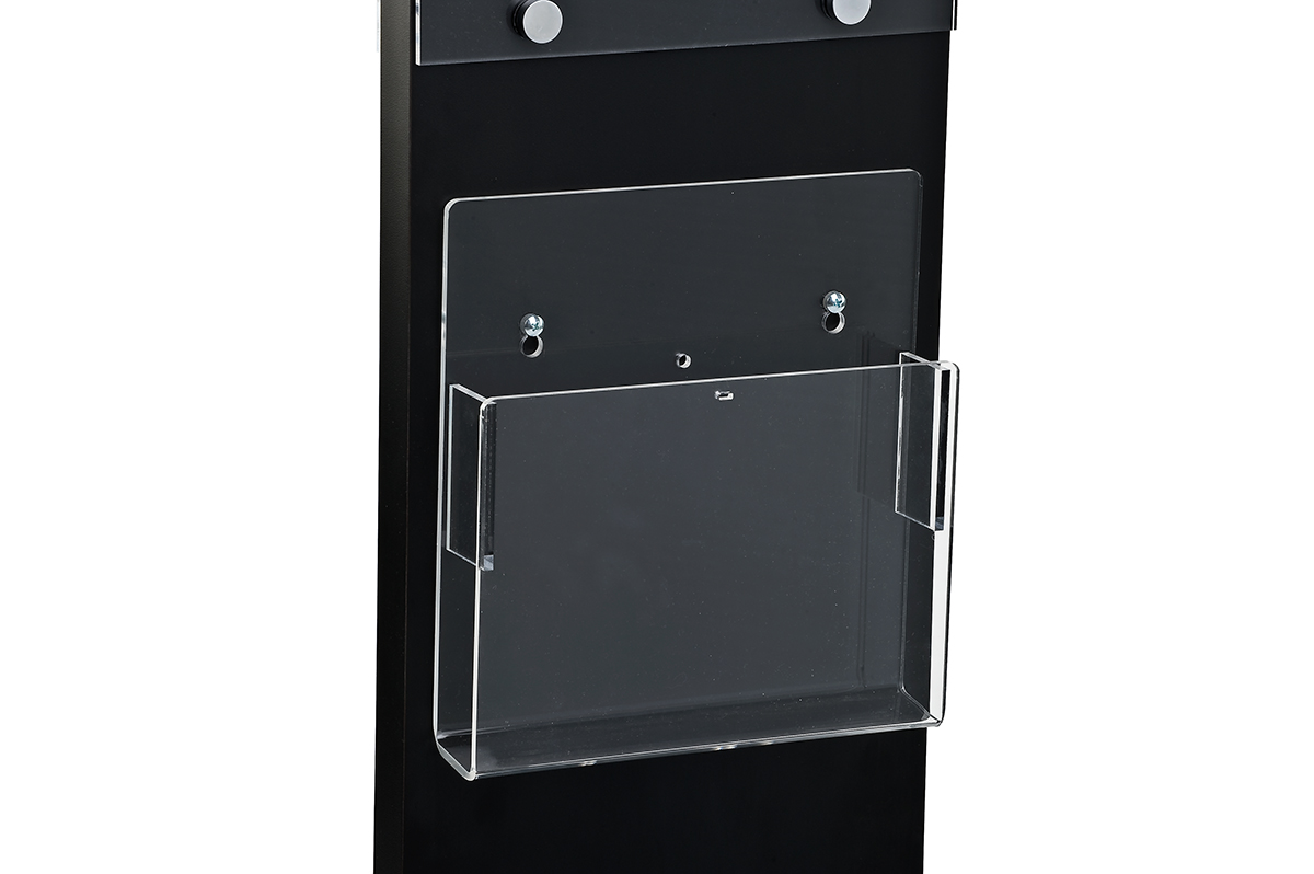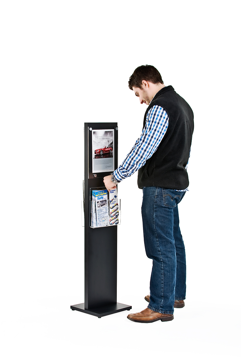 These literature holders are not only ideal for promotions, but also make great wayfinding signs. Point customers in the right direction at a large department store using this plastic pocket frame, acrylic display stand for signage that also displays literature. This plastic holder can similarly be used to designate which features are playing in which room of a movie theater. This brochure holder, acrylic display stand for signage can also be used for advertising events. Let patrons know what the next big production will be at the local theater, or offer sample sizes of the upcoming perfume scent at a cosmetic counter. This black display stand for signage that is for advertising products and services is versatile, with the brochure pocket divider to accommodate various pamphlet sizes. This holder is also easy to assemble! Simple directions are included with a hex key. This acrylic display stand for signage, known as a brochure holder, is a unique and eye-catching promotional tool!