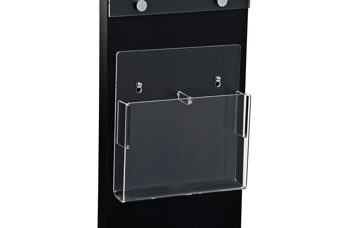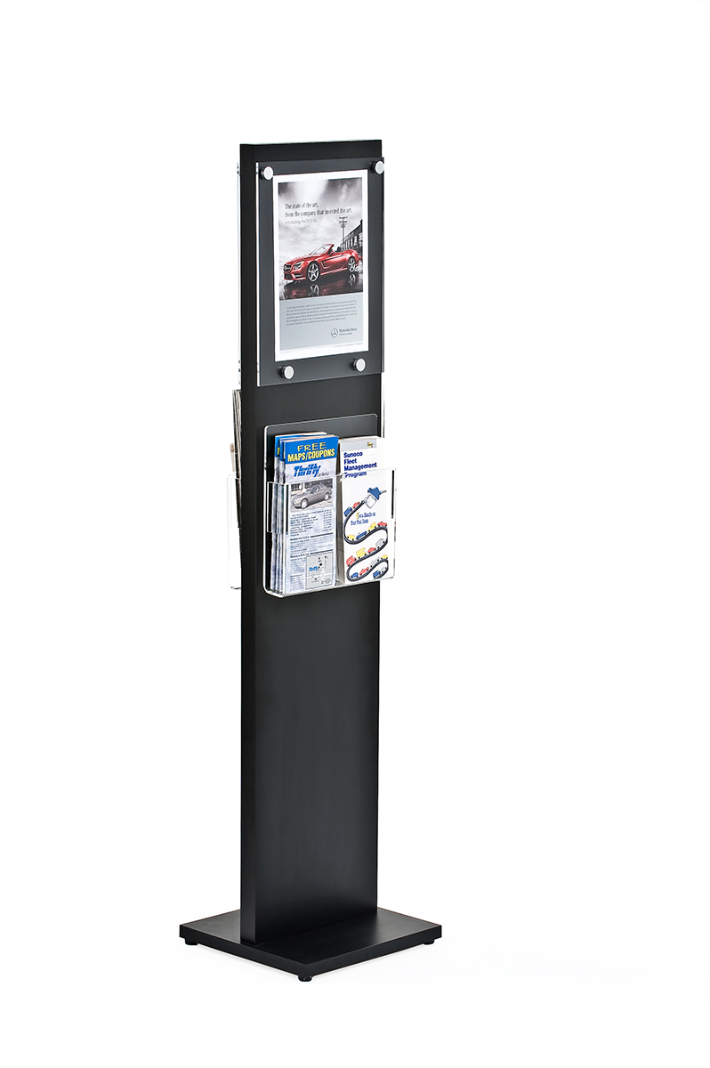 This acrylic display stand for signage that includes (2) literature pockets features a sturdy laminated MDF construction and a sleek, black finish that is sure to catch the eye. This double-sided sign holder is ideal for promotions and marketing campaigns. Use this black display stand for signage in car dealerships, retail stores, travel agencies, concert halls, movie theaters, and more. Catch the eye of potential clients with a double-sided graphics display, and offer literature on products and services in one central location! This 48-1/2” high acrylic display stand for signage will be visible in both directions from far away, drawing customer attention with its stylish look and literature. Each one of these sign holders is anchored by a heavy rectangular base made from laminated MDF that will stay upright even in crowded venues. This brochure holder, acrylic display stand for signage is a unique and effective way to market products and services.