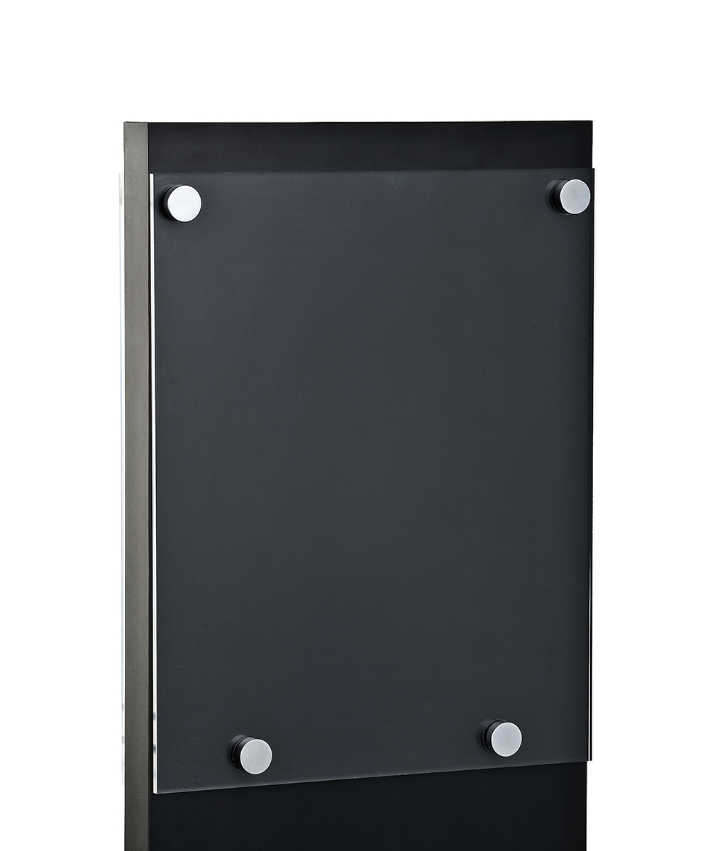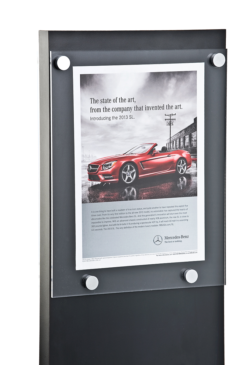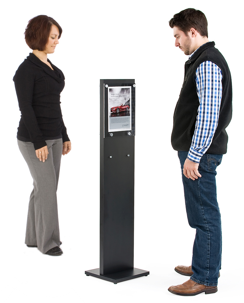 This double-sided acrylic floor stand for 8-1/2” x 11” material features an eye-catching black finish and a sturdy laminated MDF construction. This sign holder is sure to stand out in any environment while seamlessly coordinating with any décor. Each double-sided acrylic floor stand poster display includes (2) protective panels and (8) silver-finish standoffs. To present promotions, simply place the signage inside the transparent acrylic sheet, and twist on the (4) standoffs. The process can be repeated on the opposite side for showcasing (2) posters. This poster display, double-sided floor stand that is black could not be easier to use! This standing literature holder makes a great addition to a variety of environments. Use this double-sided acrylic floor stand in department stores to point shoppers in the right direction, or display a menu in the lobby of a restaurant for guests to peruse while waiting for a seat. This sign holder is also ideal for malls, community centers, movie theaters, and more. This sign display, double-sided floor stand that is 48-1/2” high is sure to catch the attention of potential customers seeking directional information.