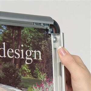 The poster display has a snap frame which opens for easy insertion of your graphic. Simply open each side of the poster display, place in the poster and snap shut each side in succession. The poster display, like similar sign holders, has 4 rounded chrome-look corners. These corners accent the frame but also provide a safety feature. Squared corners could cause scratches. The poster display has a weighted circular base to prevent easy tipping. The poster display is a pedestal display that takes up a relatively small footprint.