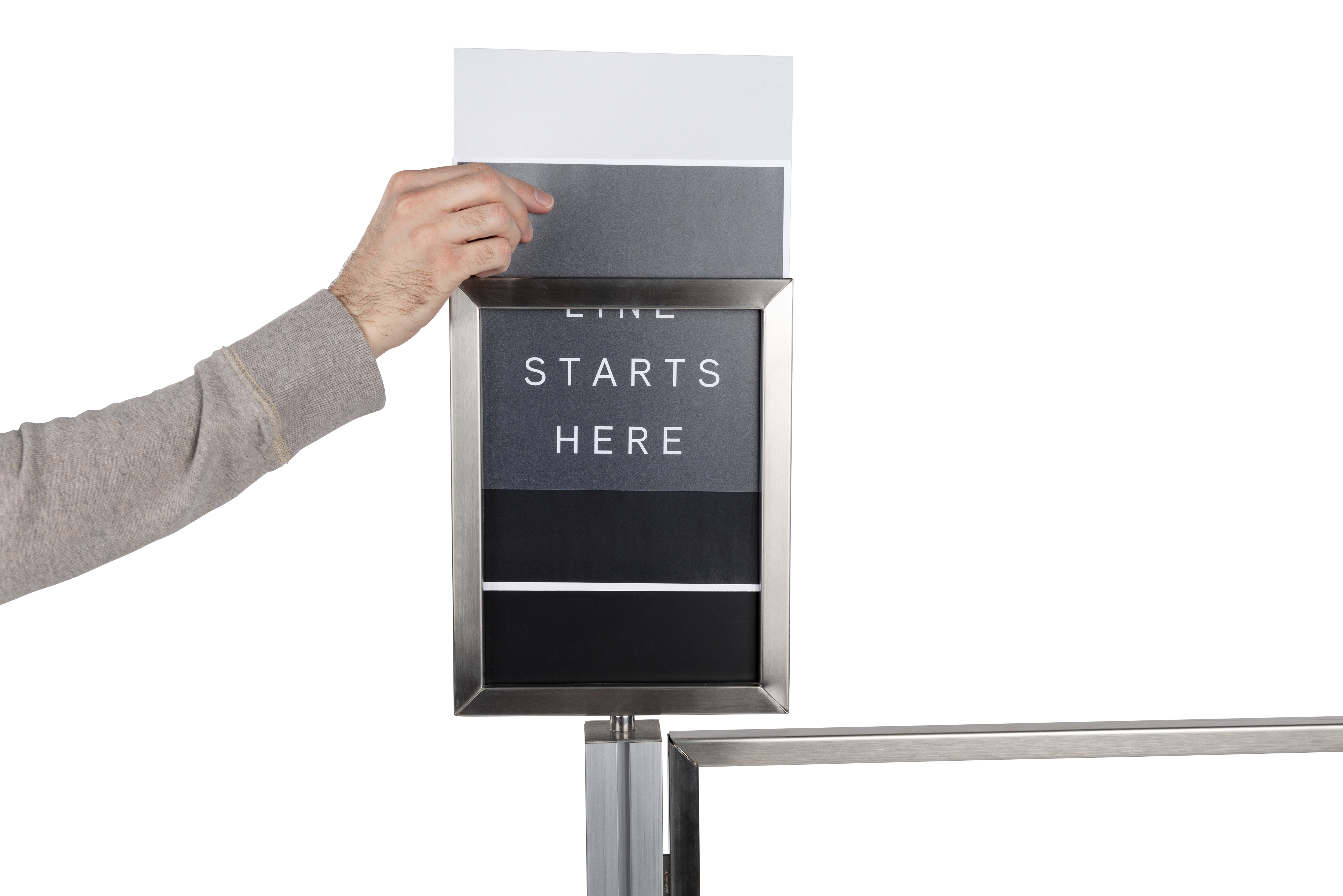 This crowd control barrier sign helps to direct customer flow by allowing you to insert navigational messages and more atop your queue line posts. Thanks to a screw-on design and slide-in loading style, setup is quick and easy. Mount this 8.5” x 11” portrait-oriented crowd control barrier sign to your queue posts to improve customer experience.