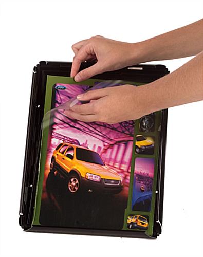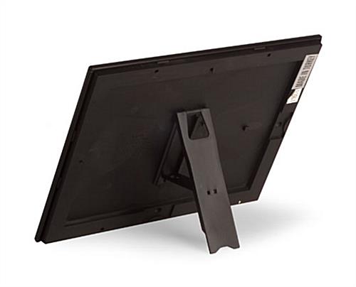 This sign holder, quick clip snap frame is great for displaying photos, advertisements, and other 8.5″ x 11″ prints. This snap frame can be used as a wall mounted or countertop display. Four hinged sides flip open and close in a snap for quick and easy graphic changes. This snap frame also features a black metal border that has a matte finish and slim profile. A non-glare lens covers your sign and protects it from damage. This quick clip snap frame, also known as a sign holder, comes with a fold out easel made out of molded plastic. When used as a countertop sign display, this easel can easily change from a vertical or horizontal position. The frame can also be mounted to a wall; screws and anchors are provided. This snap frame holds 8.5″ x 11″ prints, however, a portion will be covered by the frame.