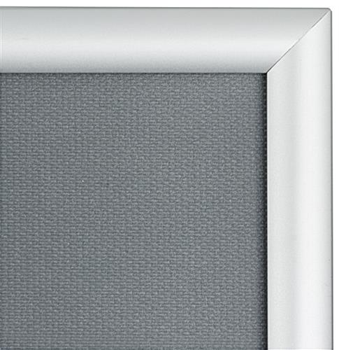 This 8.5 x 11 silver snap sign frame features a sleek 25mm rounded aluminum profile with an anodized finish. Two dowel attachments are included with each front loading holder to allow for tabletop display. The easy change sign frame is also wall mountable with all necessary hardware included. The stylish aluminum profile makes this holder ideal for business use. Many customers use the sign frame to display way finding graphics or name plates. Each front loading holder can be used in portrait or landscape orientation, and includes a protective PVC lens to ward off dust and dirt.