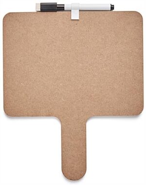 Our dry-erase answer paddle kits have a single-sided, unruled melamine surface with a wooden back, making them great for lecture halls, trivia nights, and classrooms. Each pack comes with a black marker with an eraser on its cap and a plastic clip that attaches to the whiteboard to prevent students from losing them. The write and wipe dry-erase answer paddle kits are non-ghosting, which keeps them looking new and clean. The high-quality mini markerboard design is resilient and durable, making them perfect for writing out weekly meal plans or complex math problems. These write and wipe whiteboards have rounded corners so the user can be comfortable and safe. Every mini response board comes in a pack of twenty-four to use at your non-profit event or bible study classroom. Our durable dry-erase answer paddle kits are easy to hold and fit in backpacks for students on the go.