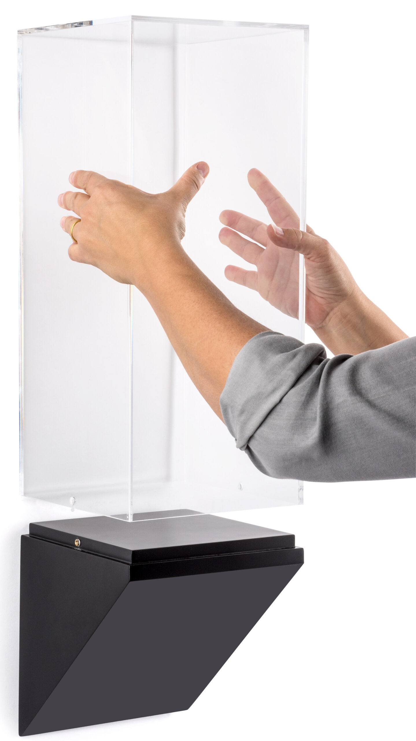 This wedge pedestal gallery wall display is perfect for use in a public or private collection with its modern design and 18” acrylic vitrine to beautifully showcase sports memorabilia, antiques, or fine art. The MDF shelf has a 55 lb. weight capacity, ideal for heavier pieces such as sculptures or vases. Ideal for museums, libraries, home, or retail settings, the black gallery wall display is 8” wide and has an 18” tall acrylic vitrine on a tapered base for a minimal yet attractive design. Simply lift the clear enclosure from the shelves to access the interior and place antiques or sculptures, then use the built-in screws along the sides to secure your fine art and prevent theft or tampering. Whether used in a private collection or museums, this modern showcase emulates a high-end look to complement room décor and attract attention to the stored collectibles. Installing the wall display is easily done by mounting the recessed Z-brackets onto a flat surface with the included anchors and, if desired, add the felt strip to minimize scratches and keep the unit flush.