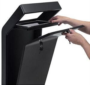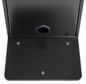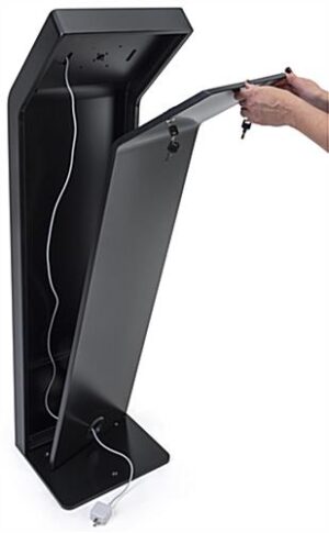 This tablet floor stand is both a secure locking kiosk enclosure and an elegantly designed digital touchpoint display. The modern freestanding unit invites customer interaction with any charging wires safely hidden inside the simple, 2-piece steel build. Place an anti-theft tablet floor stand in a hotel lobby, retail sales floor or trade show booth to provide product information, wayfinding, and digital check-in. For added security, the base can be bolted to the floor with included hardware.