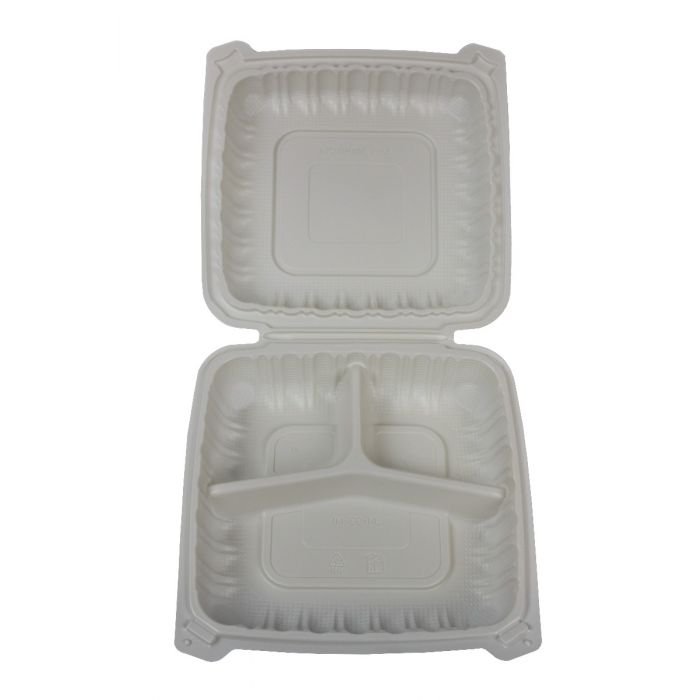 9” x 9″ x 2 3/4″ 3-Compt White PP Plastic Hinged Lid Container – 150/cs (2/75)