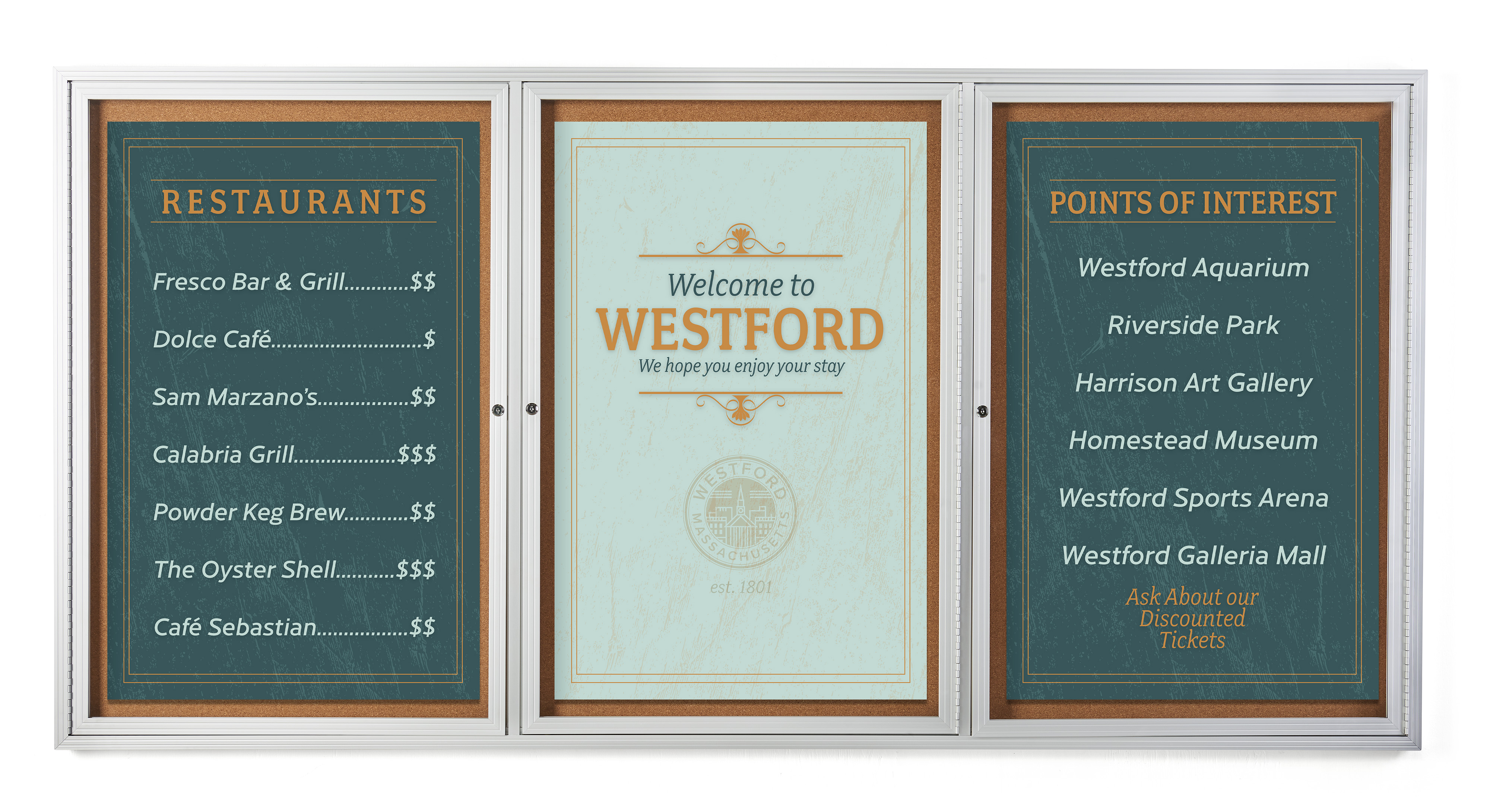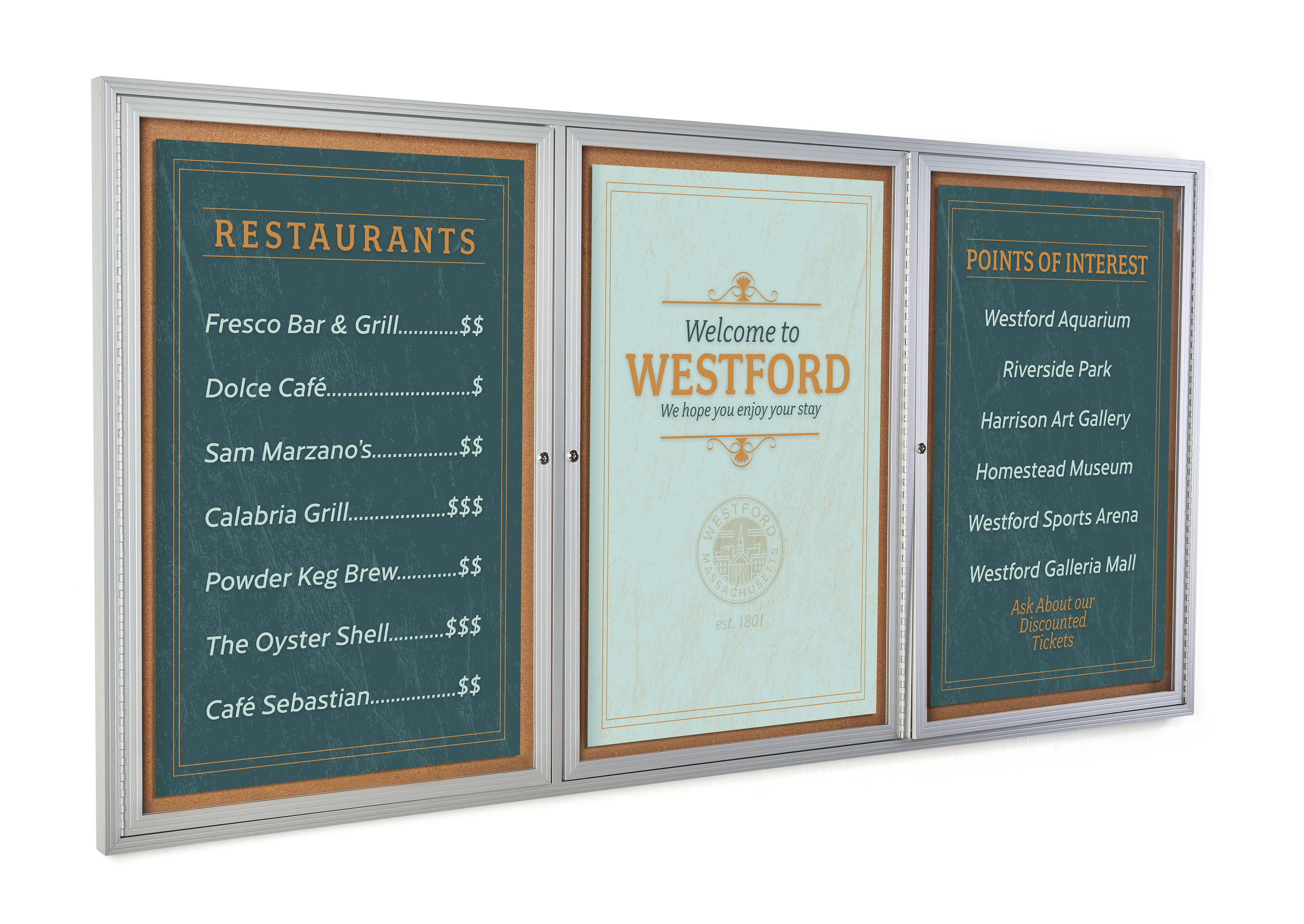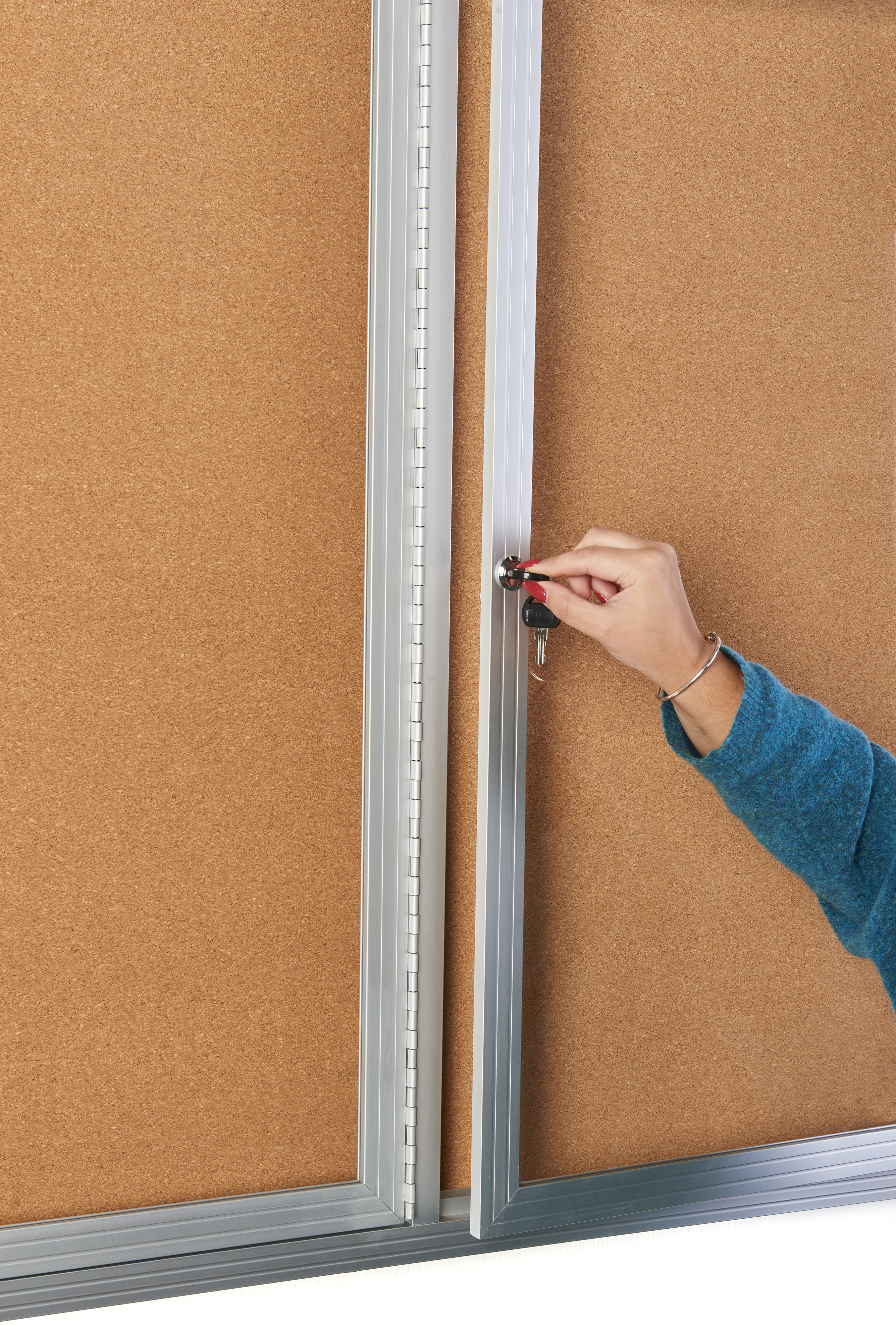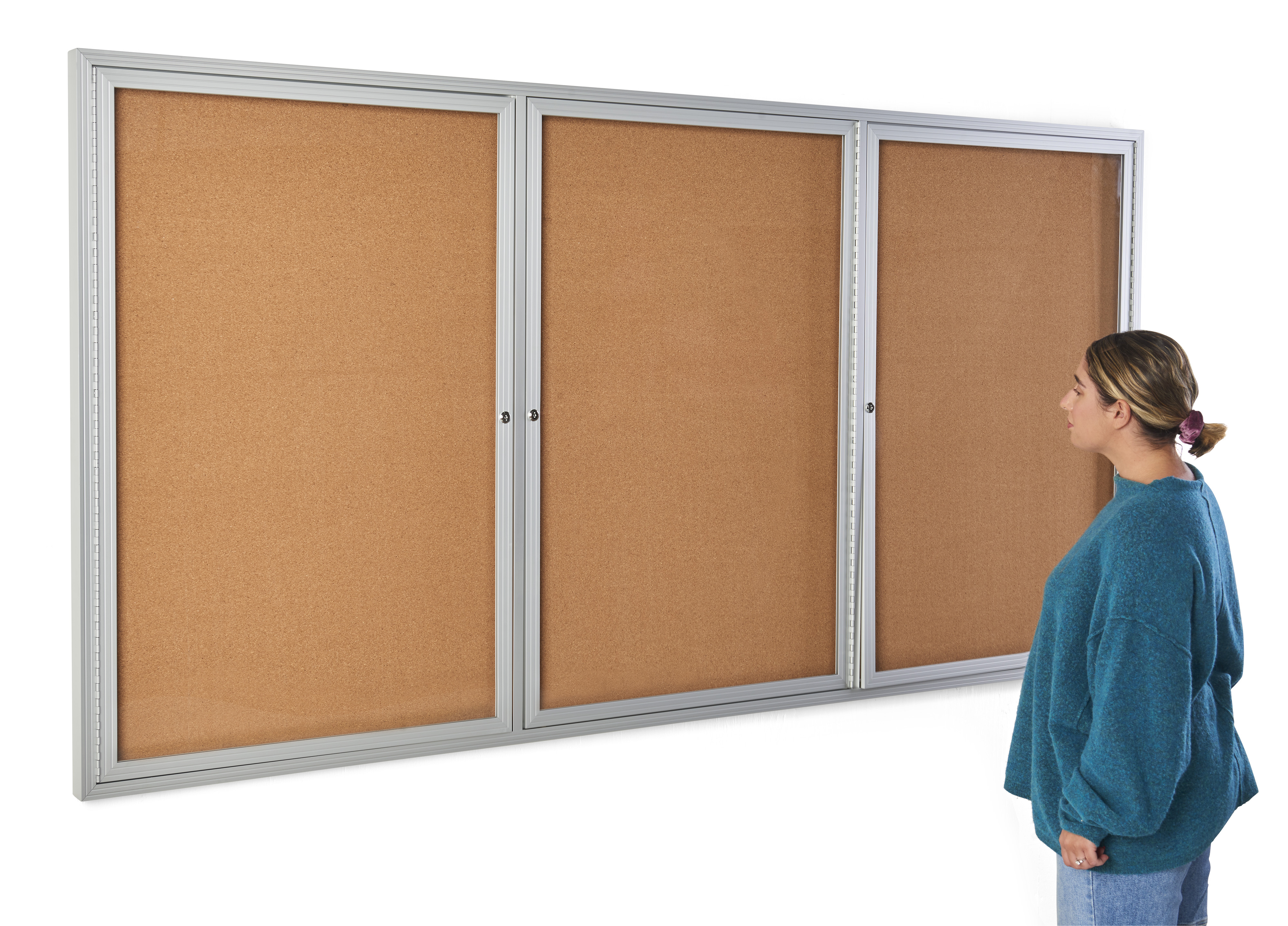 96″ x 48″ 3-Door Locking Cork Board with Anodized Aluminum Frame