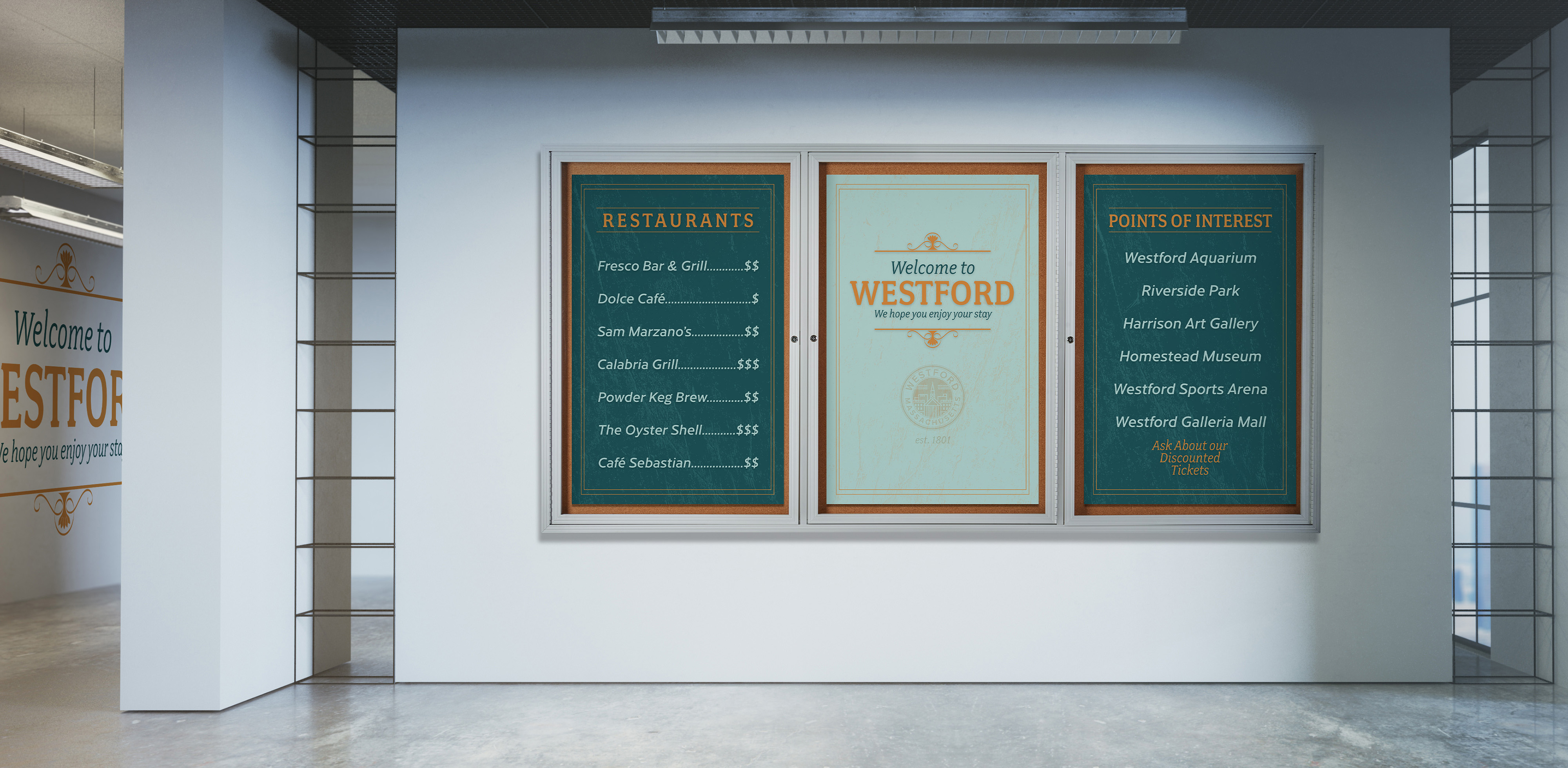 96″ x 48″ Enclosed Bulletin Board with 3 Locking Swinging Doors – Silver