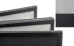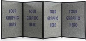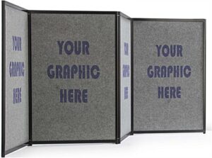 for easy toting. Great for quick mounting solutions, the hook and loop receptive display board can affix different hook and loop accessories including flyers, magazine racks, brochure pockets, and other literature holders which are often used for promoting company services and products. On-the-go representatives find the black and grey stand useful since it provides (2) different backdrops and the personalized artwork available with each product. The tabletop sign can fit on nearly any size conference room table or exhibit countertop for an eye catching display board. The black and grey system features (4) panels with custom printed graphics that are affixed to the hook and loop receptive material upon delivery can be designed using the artwork templates provided on each page.