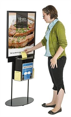 This acrylic charity collection box is a great custom tool to help boost your fundraising. Keep your sign holder constantly updated by switching out the graphics in both the double sided poster stand for 22” x 28” posters and the 8.5” x 11” donation bin front pocket. Its versatility lets you use this custom collection box for anything from a fundraising event, to a suggestion bin at a restaurant, to a giveaway contest at a trade show. With its polished black finish, this sign holder is a simple yet attractive floor display that can help draw a crowd in busy lobbies and events. Place donation or sign-up forms in the case’s two side pockets for added convenience. Each collection box comes with two sets of keys to securely lock the case’s lid.
