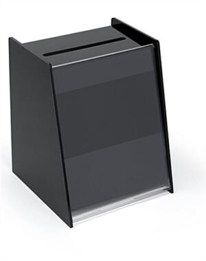 The key feature of our full sized ballot box, lucite suggestion box is its ability to display your 8-1/2″x 11″ graphics for full-face viewing. Change your message or promotion anytime with this comment box model! This attractive black acrylic ballot box measures a generous 11″ tall x 9″ deep. The protected clear acrylic sign holder functions as a slide-away cover that latches to the back of the box. Drop slot is 7″ long by 1/2″ deep for easy accumulation of many entry forms or ballots, making this an unique acrylic suggestion box.