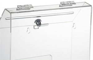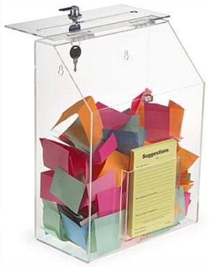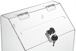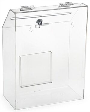 This clear suggestion box with 1 pocket features a locking mechanism and includes a set of two keys. Each donation holder is made from acrylic and includes pre-drilled holes for wall or tabletop mounting. Each locking suggestion box has a slotted lid for easy deposits of suggestions or votes. Many businesses use the unit as a donation holder for office coffee funds, small charity initiatives, and more. Alternatively, the acrylic container is also great for depositing raffle tickets and contest entry forms. The suggestion box features a set of two keys, so that users can feel secure leaving the contents of this suggestion box unsupervised. Each unit includes all the hardware needed to secure the holder to a tabletop or wall.
