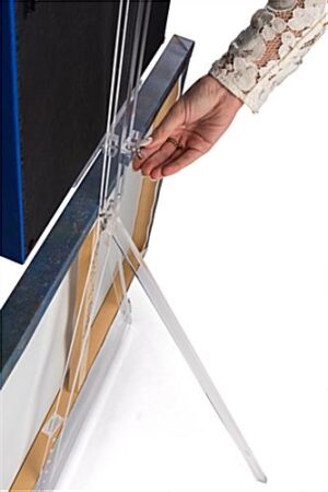 Our acrylic tripod easel features a height adjustable front tray and two bottom pegs to allow the user to display two framed artwork pieces simultaneously. The slim triangular modern design is constructed of high-quality material that creates a sturdy frame to create a stable exhibit. This sleek clear acrylic tripod easel for framed artwork and welcome announcements allows dual displays to optimize space. Featuring a folding back leg, the triangular clear exhibit folds flat to easily transport it from one place to the next. The modern and transparent display fixture will help to make welcome announcements and canvas prints the main focus of the space. Complete with rubber padding on each leg, the acrylic tripod easel will prevent floor scratching and will create a wobble-free presentation.