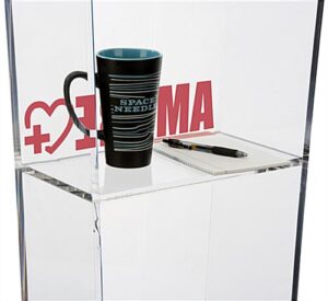 This transparent podium with custom graphic is a great display stand to have at your next trade show or public speaking event. Featuring a clear acrylic finish, these products are high in quality and low on price! The slender transparent podium includes a cleaning cloth which helps rid the stand of dust, fingerprints, and other markings. Also, the display has an interior connected shelf to place notes or a drink on when giving a public announcement. Place the podium in an ideal spot on the floor to show off your company’s logo for a more distinguished presentation. This trade show product provides the hardware and tools you need for a quick and effortless assembly.