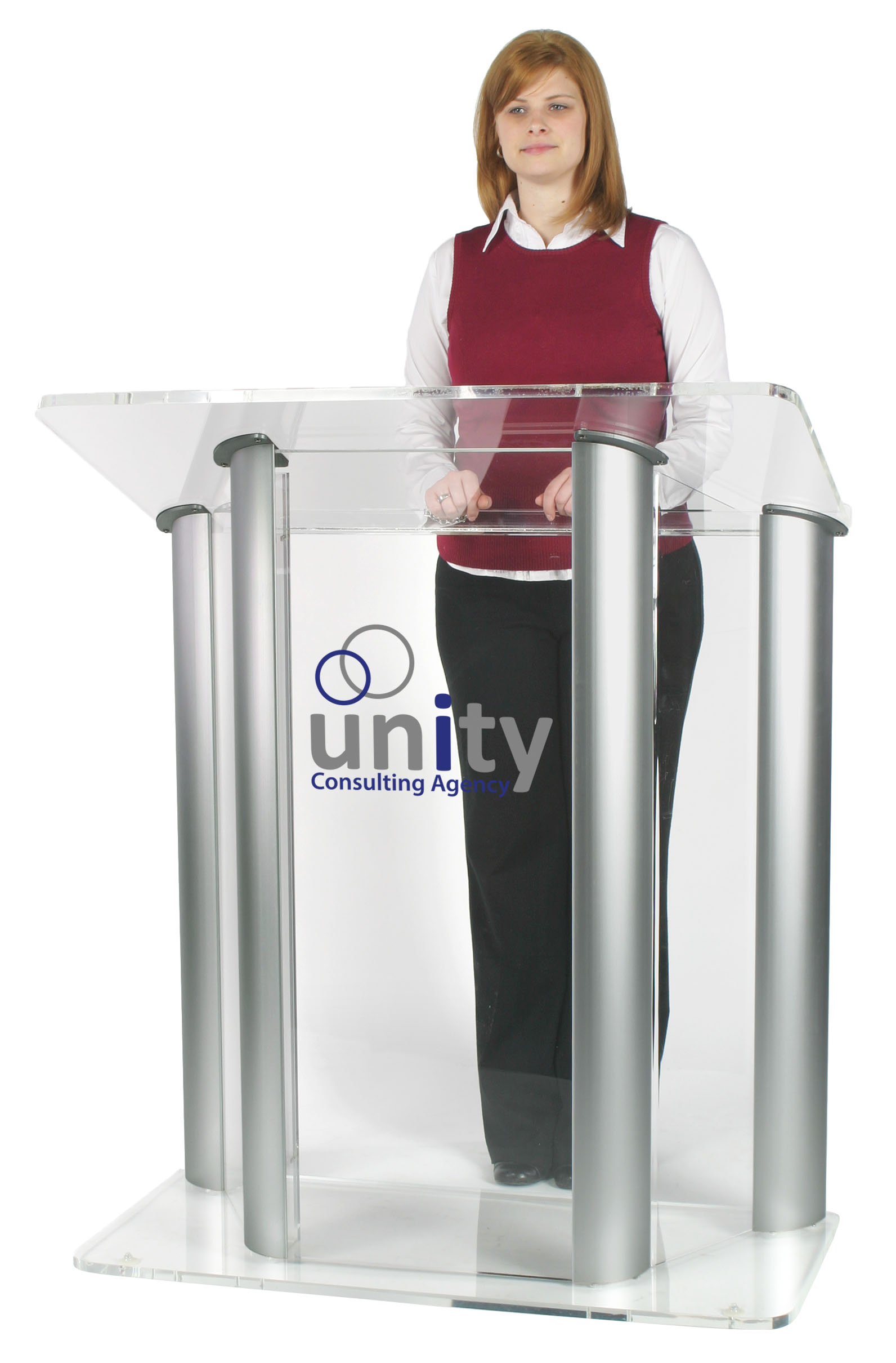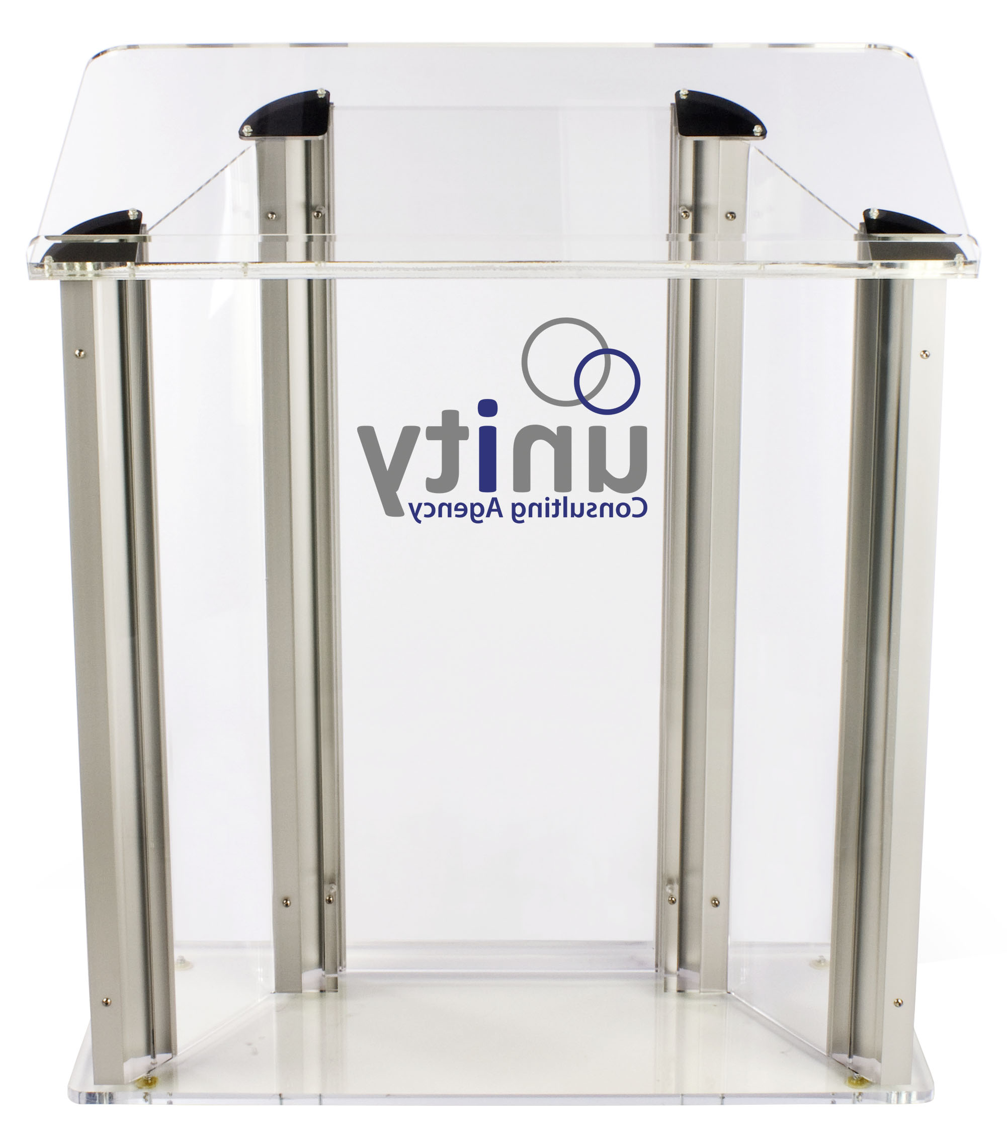 Acrylic Podium with Aluminum Sides, 2-Color Custom Graphic – Silver