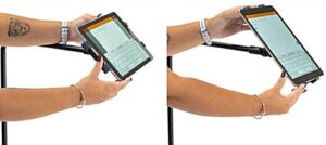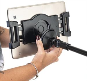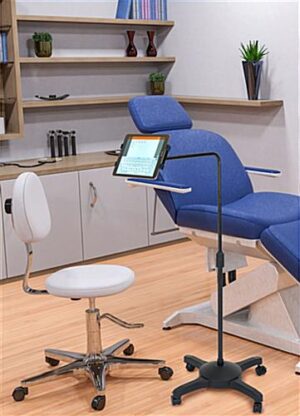 This L-arm adjustable tablet holder with wheels has a spring bracket that fits 7.7″-9.6″ iPads and rotates 360 degrees, providing ease of use and many viewing angles. The stand is excellent for holding your device at a bend, making it more accessible for medical patients, office collaborations, and small children. This L-arm adjustable tablet holder has four heavy-duty locking casters that can lock in place when in use and quickly unlocked when needing to be moved. The stand is lightweight and made of plastic, with a weighted metal base making this unit highly portable. This easy-to-assemble iPad holder has many great features, one being that the pole ranges in height between 27.5″-44.5″. This extending rod makes it convenient and accessible for people working at different heights. This L-arm adjustable tablet holder with wheels and spring bracket is a great way to display information within your business since customers can digitally fill out forms, place food orders, and self-check-in to lower instance of human contact.