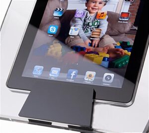 This height adjustable iPad floor stand is sold with a clear acrylic enclosure with black accents. The mount accommodates generation 2, 3 and 4 tablets and allows access to the charging port. This iPad floor stand has a glossy black post that can be adjusted between 39.5” and 69”. The rotating enclosure can be switched between landscape or portrait orientation without having to remove the device. The 90-degree tilt also ensures displays are always at the best angles for users. This iPad floor stand is perfect for upscale commercial applications, such as showcasing touchscreen menus or promotional materials.