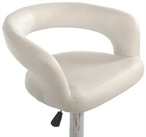 This white leather bar stool, with its contemporary and unique design, is sure to impress at your next trade show or event. Also perfect for restaurants and cafes, this chair features a height adjustable hydraulic lift that changes the unit from table to highboy elevation. Each modern bar stool has a leatherette cushioned seat with backrest that ensures user comfort. Featuring a 360° swivel functionality, each upholstered unit is great for conventions and cafes where socialization is a common occurrence. For added convenience, not to mention cost savings, this bar stool is sold as a set of two chairs! Use this height adjustable hydraulic seat in any exhibit booth or restaurant for long lasting comfort and a quality product.