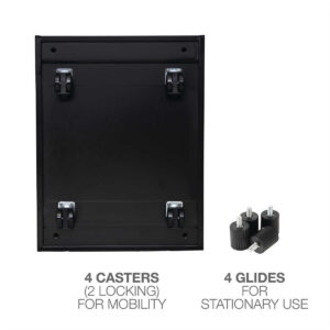 - Four casters (two locking) for mobility or four glides for stationary use.