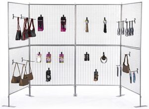 These wire art grid panels are great display systems for artwork, paintings, and portraits. The fixtures assemble quickly and easily without the need for any tools, making them ideal for travelling to craft fairs, artisans’ markets, expos, and more. The metal grid panels form a U-shaped booth that is ideal for showcasing artwork and interacting with customers. The fixtures can also be used in retail stores to hold lightweight items like makeup and hair accessories. Many customers also choose to use S-hooks to hang their products on these display systems.