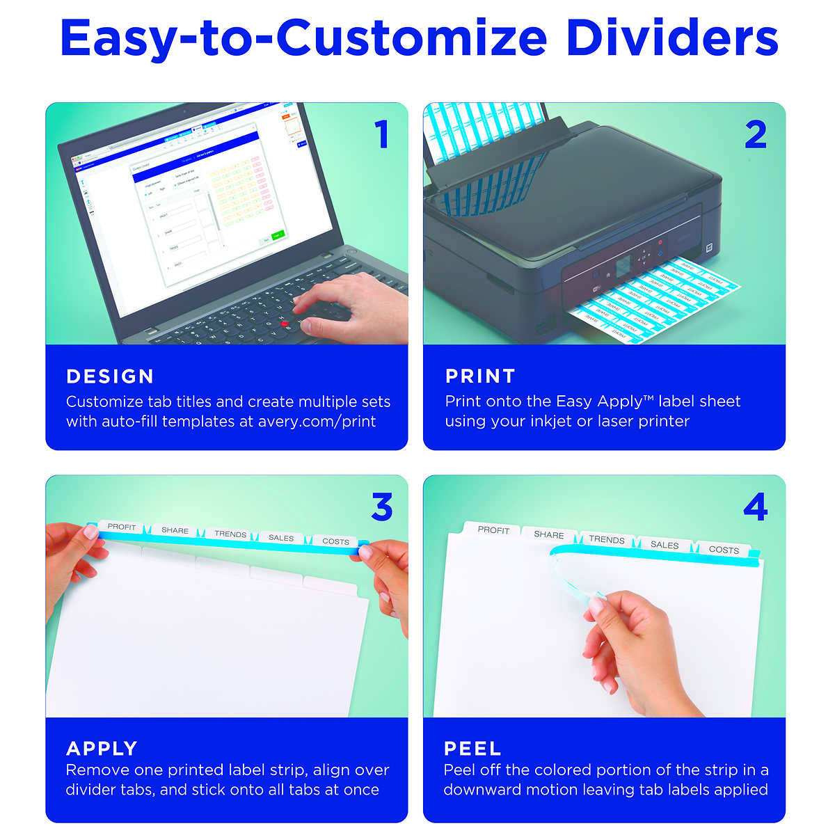 - Creating tab labels for one or more divider sets is quick and easy using free templates from Avery Design & Print