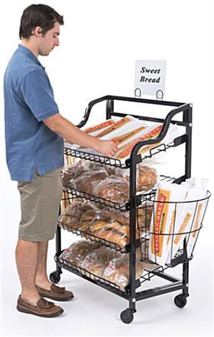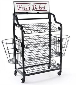 Bakery Display Rack w/ Wheels, 4 Shelves, 2 Side Baskets & Header – Black