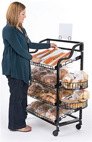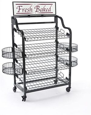 Each piece of bakery equipment for food merchandising is made of strong and long lasting, black powder coated steel and wire. This bread rack, also called a bakery cart, is equipped with caster wheels that allow the fixture to be easily moved around a retail space or into a kitchen. These wheels also have the ability to be locked so that when the stand is used as a store fixture, it will not be accidentally jostled by shoppers. This bread rack that rolls is optimal for replenishing the unit out of site from customers. The cart itself is 46” tall, while the side attachments are 3” tall, 16” wide, and 9” deep, a great size for holding jars, rolls, and small packages. Each bread rack with shelves comes with two sign holders. One piece of signage is a coil banner holder, while the other is a frame that only works with signs that are approximately 28.5” wide and 8” tall. This wire bread rack is great for gourmet food promotion in any retail environment!