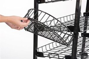 This bread rack is an ideal fixture for a bakery, supermarket, gourmet shop, or cafe. The bakers stand features four attachable wire counters for added food merchandising options. Each bread rack that holds shelves creates many opportunities for cross merchandising in retail environments. The side attachments could help to pair frosting with cakes or tapenade with French baguettes! This bread rack that is for bakeries is also equipped with (4) large shelves for displaying food items. These larger areas are adjustable and have the option of being angled forward to better promote baked goods. This bakers cart, bread rack displays donuts, bagels, cakes, rolls, baguettes, cookies on its 4 main shelves while still having room for additional items on the removable rounded bins.