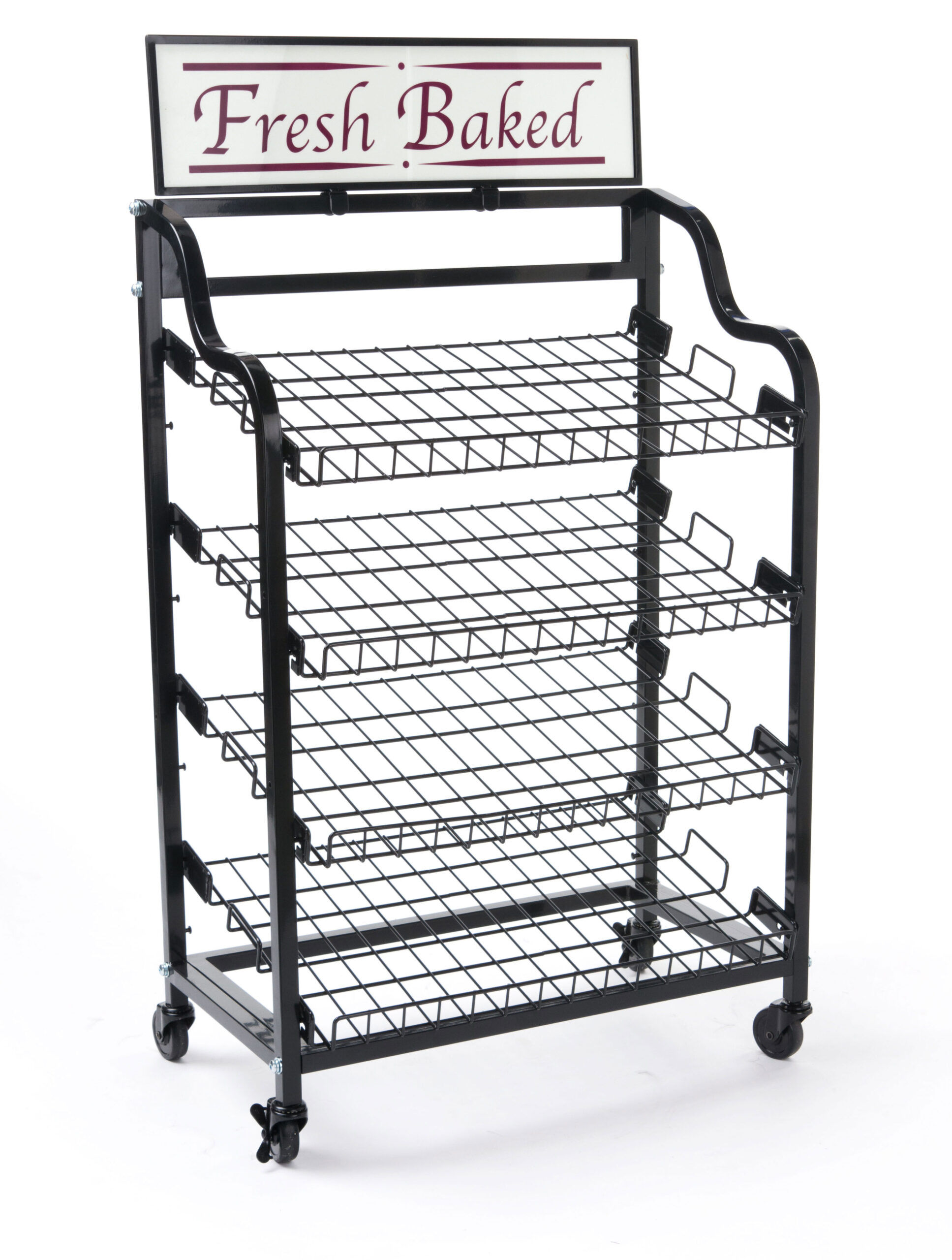Bakery Display Rack w/ Wheels, Adjustable Shelves & Header – Black