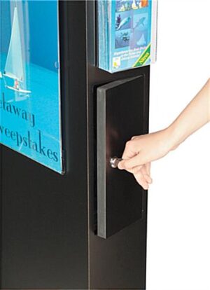Floor Standing Comment Box – Perfect for ballots, bank deposits, and large sweepstakes contests. Upscale black laminate body with top drop slot and tamper resistant locking side door. The base is constructed from MDF with black texture powder coating. Includes two pockets for 4″ wide brochures and two clear acrylic 11″w by 17″h channels (one on each side) for insertion of your color graphics.