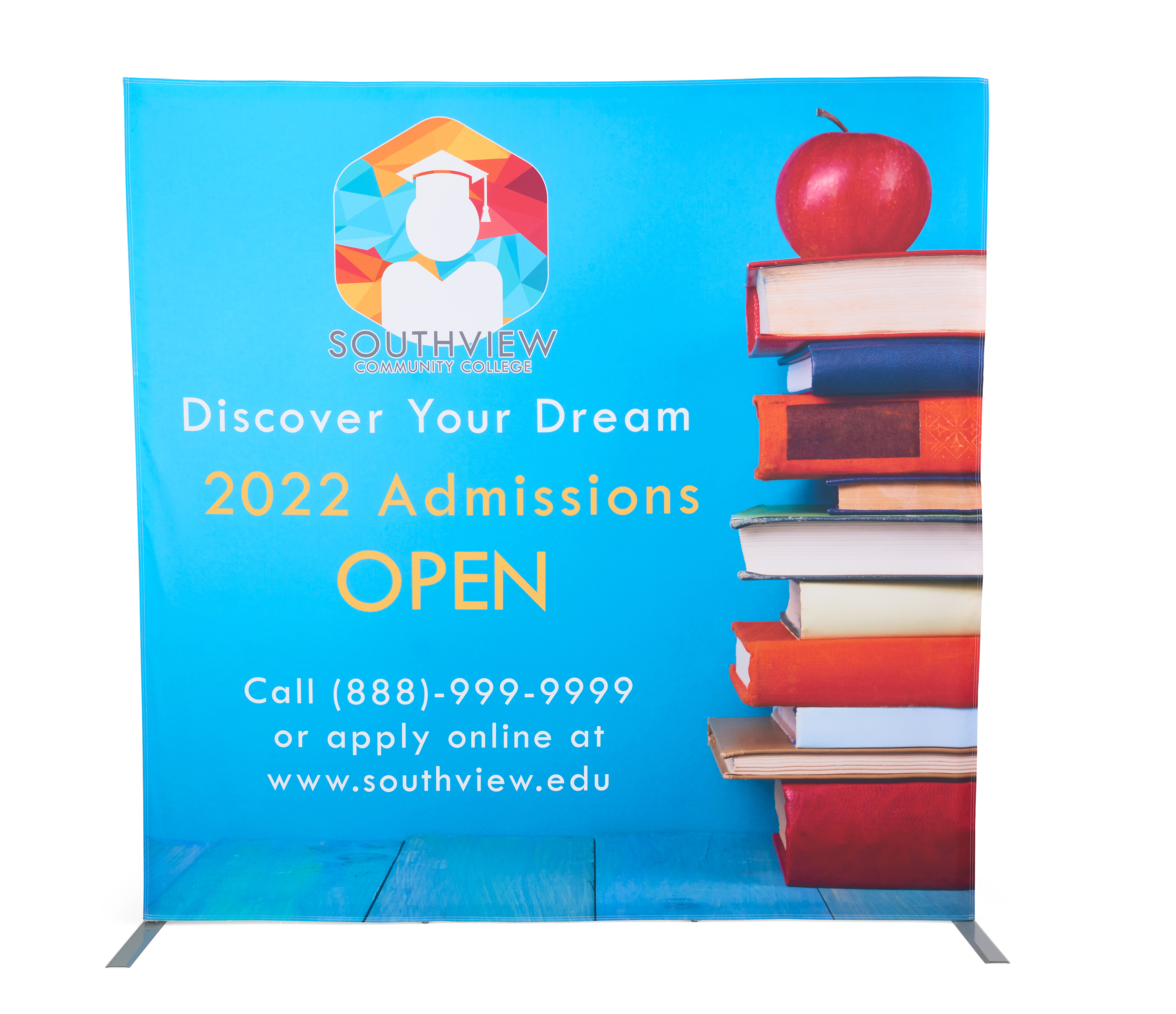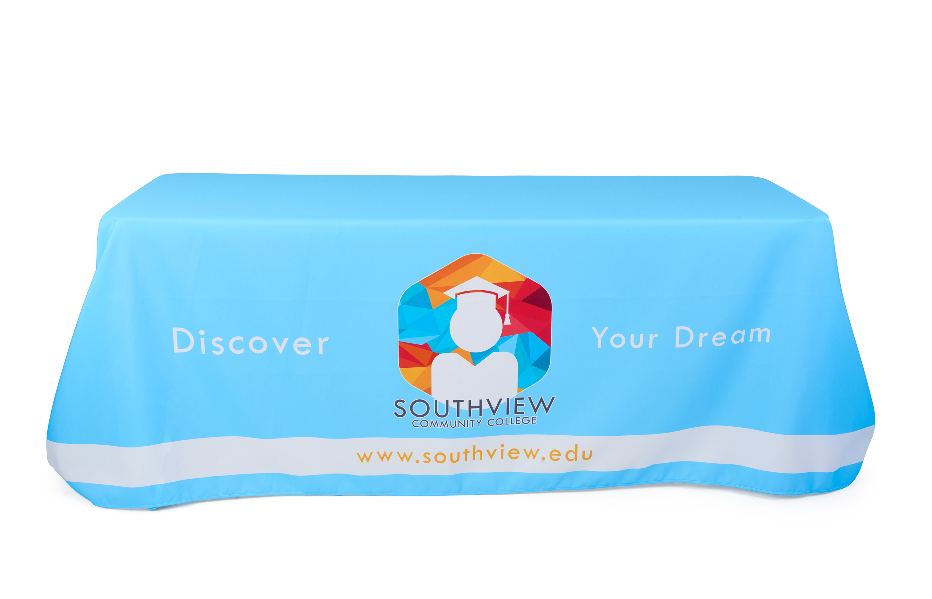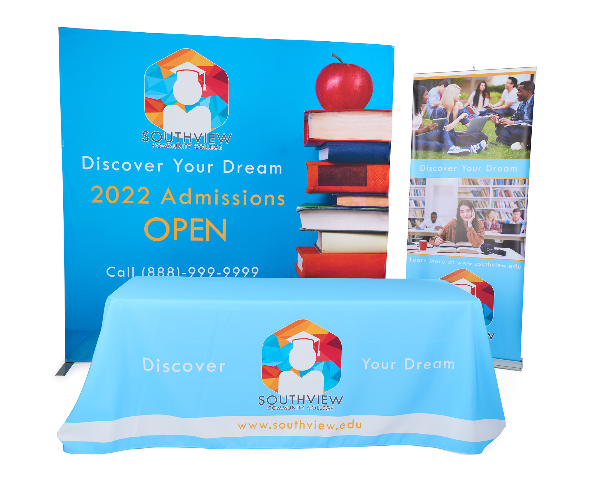 Includes: Custom Quick Fabric Display, Full Color Printed Table Throw and Narrow Base Banner Stand