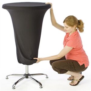 The wrinkle free design of this black tablecloth for FOLDR2646 provides ease of use as well as functionality. The spandex design offers a form-fitting slipcover to add to compatible high-top tables. Great for any party, function or tradeshow this spandex cover allows you to better engage with consumers or offers your guests a place to enjoy a cocktail over. The stretch fitted design meant for the standing tables gives you a sleek look. Simply slide the cover down coordinating tables and slip the 5 corner base pockets over each foot.