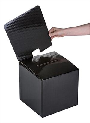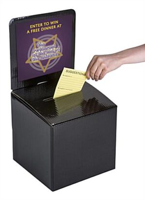 This black cardboard entry box is a versatile and affordable option for any of your ballot, contest or even fundraising needs. Each lead container can fold flat, making it portable and easy to store. With its removable header, you can make this lightweight entry box a custom display piece. Attach a graphic or sign above the container’s top slot to bring attention to your ballot, contest or raffle. Featuring a shiny finish, this entry box is a sleeker and more attractive option than other containers constructed of similar material. Coupled with the removable header, this holder is an affordable option for those looking for a custom display bin.