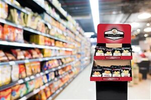 This custom cardboard display has a 2-tiered design along with personalized graphics adhered to the header and both shelves for the ideal POS fixture. The corrugated build is lightweight to easily move around the retail store and prop with sales merchandise. This floor standing cardboard display includes full-color graphics stickers that are applied prior to shipping to ensure proper placement. Promote summer products alongside a sunny themed image or potato chips with an organic brand design for a targeted marketing POS fixture. These floor standing point of purchase fixtures are perfect for encouraging last minute purchases in a variety of retail stores. Place this cardboard display at the ends of aisles or in trade show events with featured designs to boost sales and run through excess inventory.
