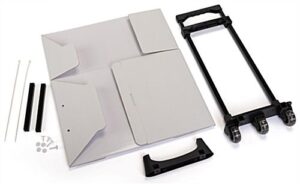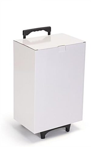 Our white cardboard exhibition trolley box is a completely disposable mobile transportation device that will get you in and out of your trade show event in record time. The case with wheels is made of high-quality recycled corrugated carton material and it features a simple and elegant glossy white finish. This cardboard exhibition trolley box allows the user to leave heavy and intrusive suitcases and bags behind to make travel easier and more convenient. We’ve ensured that the case with wheels can get you moving around quickly by including 1” smooth gliding wheels. Simply unfold the high-quality corrugated carton and secure it into place within seconds – this is one of our fastest products to assemble. Capable of carrying up to 30 pounds, and complete with up to 1.4 cubic feet, the mobile exhibition trolley box can help you carry most of your trade show essentials.