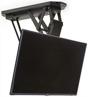 This motorized drop down TV mount will awe your customers as it lowers from the ceiling with the touch of a button. A programmable remote control allows you to preset memory settings to save the perfect angle for every occasion. The drop down TV mount for normal or slanted ceilings is VESA compatible and features a 66lb. weight capacity to accommodate almost any screen up to 42″. Integrated cable management will keep your bracket looking professional and clear of unsightly wires. Tilt your monitor as much as 75° for a great viewing experience in homes, offices, bars, and more. Get your drop down TV mount complete with remote control and steel bracket to show off your big screen today!