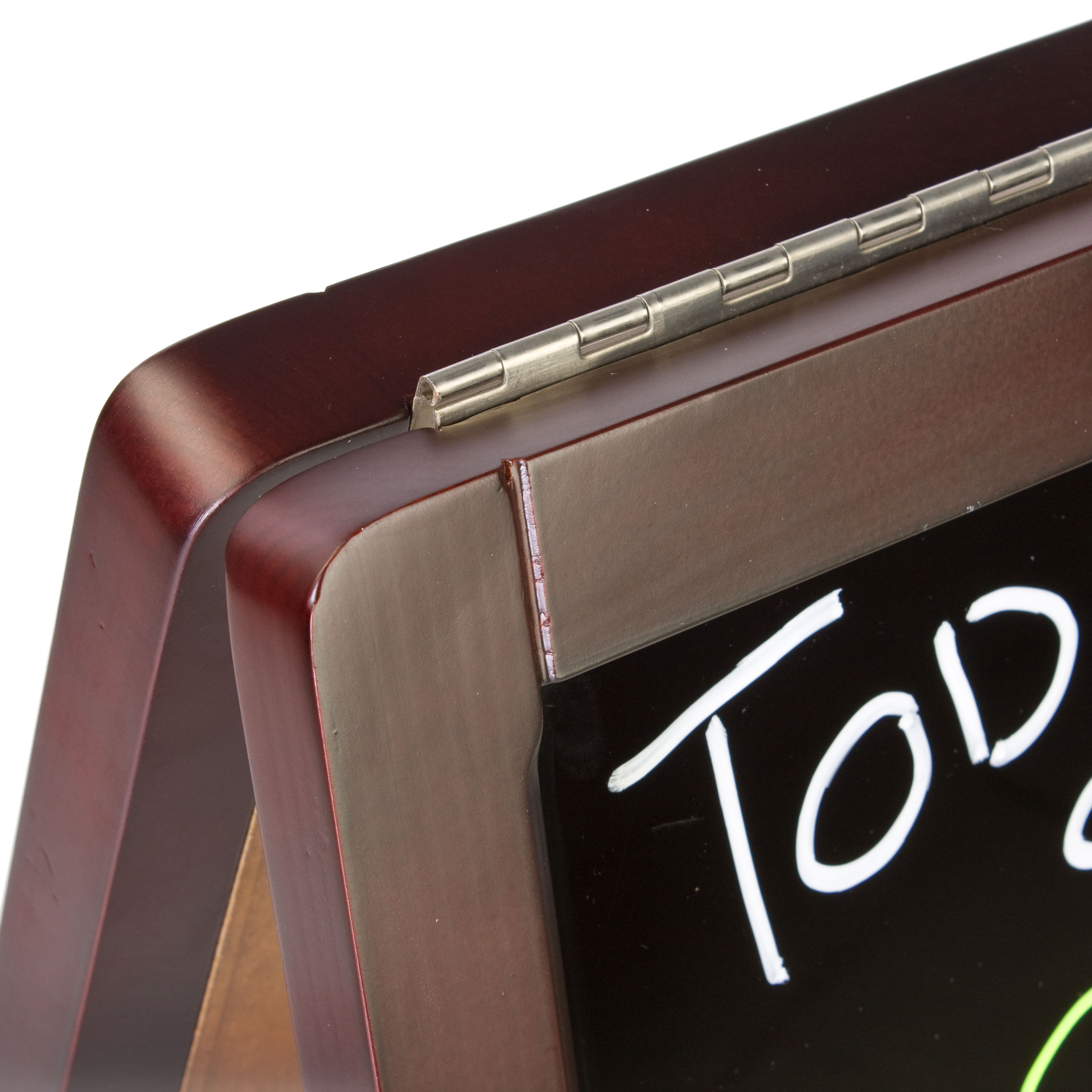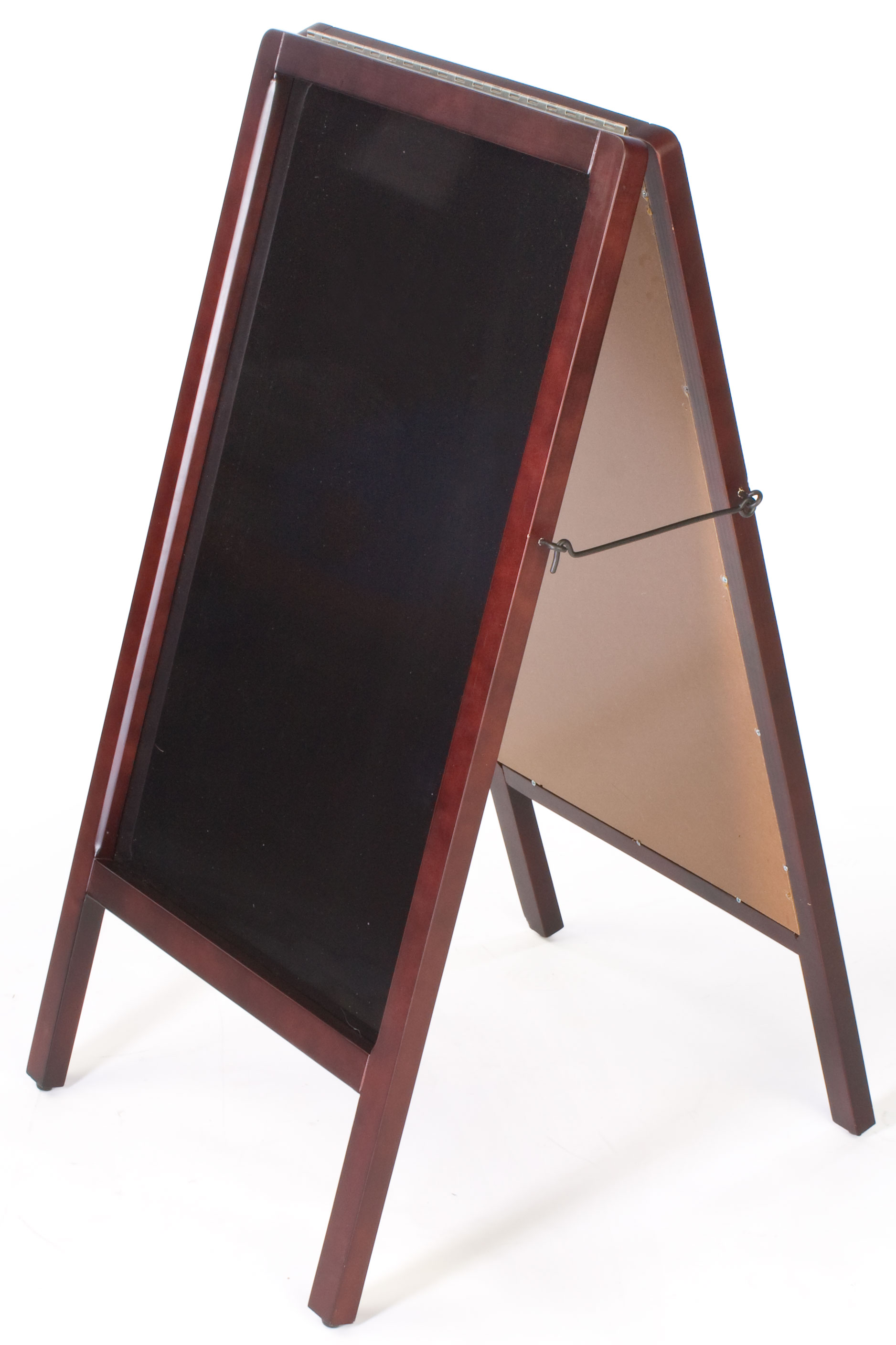 Sidewalk signs, like the black chalkboard a-frame seen here, are double-sided, giving users plenty of space to write out signs. Passersby will see messages from either side of the sidewalk. Businesses can utilize this chalkboard a-frame to display menu listings, promotional signage and more. This sidewalk sign is a great advertising tool for use in places like restaurants, bars, night clubs and store fronts. This chalkboard a-frame, such as a wood-framed blackboard, can be used in restaurants or sports bars to promote “Daily Specials” and “Menu of The Day”. The blackboard can also be used in boutiques or small local stores to advertise special promotions or important announcements to direct sales to their business. This chalkboard a-frame attractively conveys your sales messages and daily specials to pedestrians and passersby. The beautiful dark mahogany wood finish makes these sidewalk signs appropriate for use in any upscale environment as well. The chalkboard a-frame is best used indoors, but it is suitable for outdoor use in ideal conditions. When not in-use, this blackboard menu display can be folded together for easy storage.