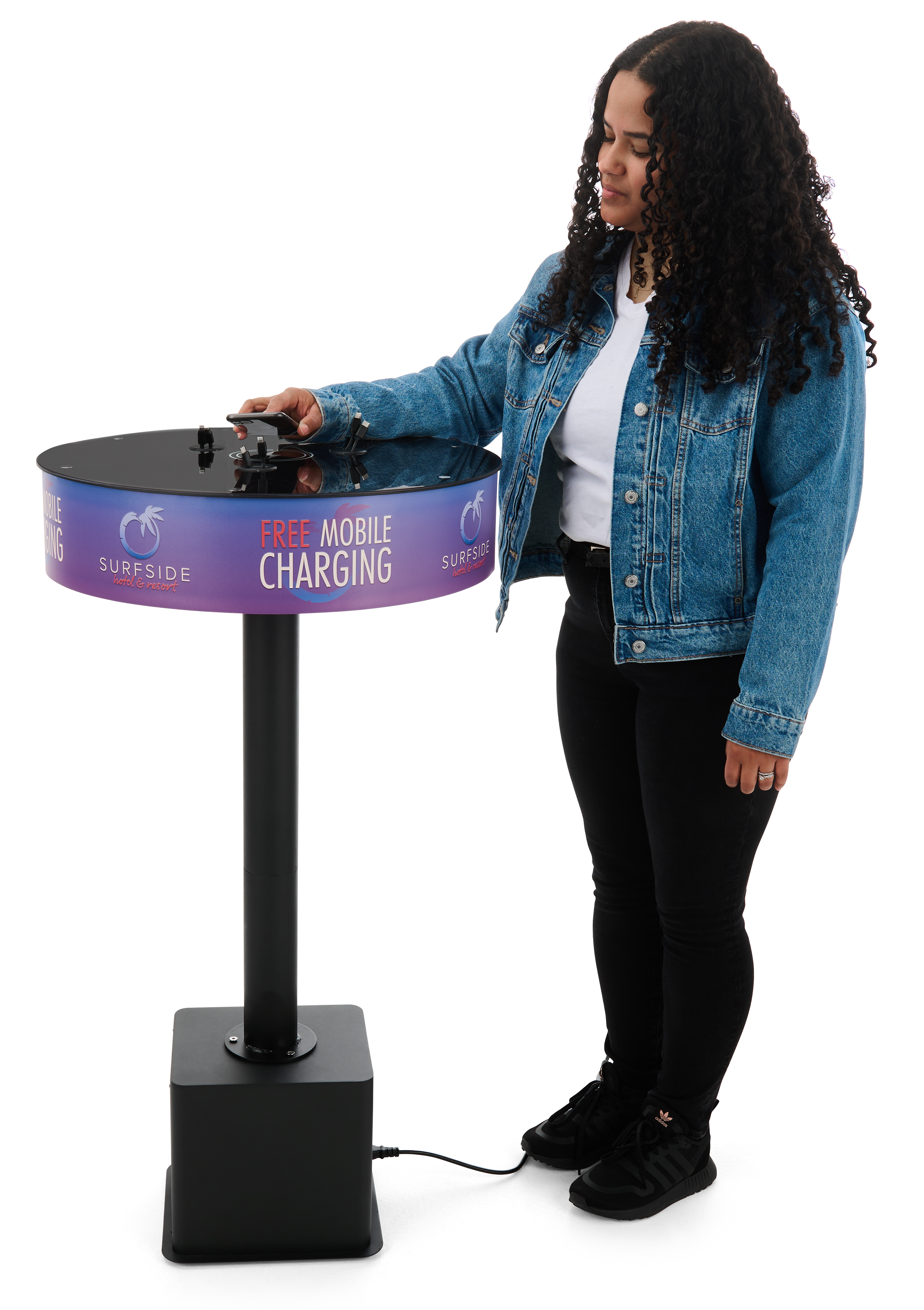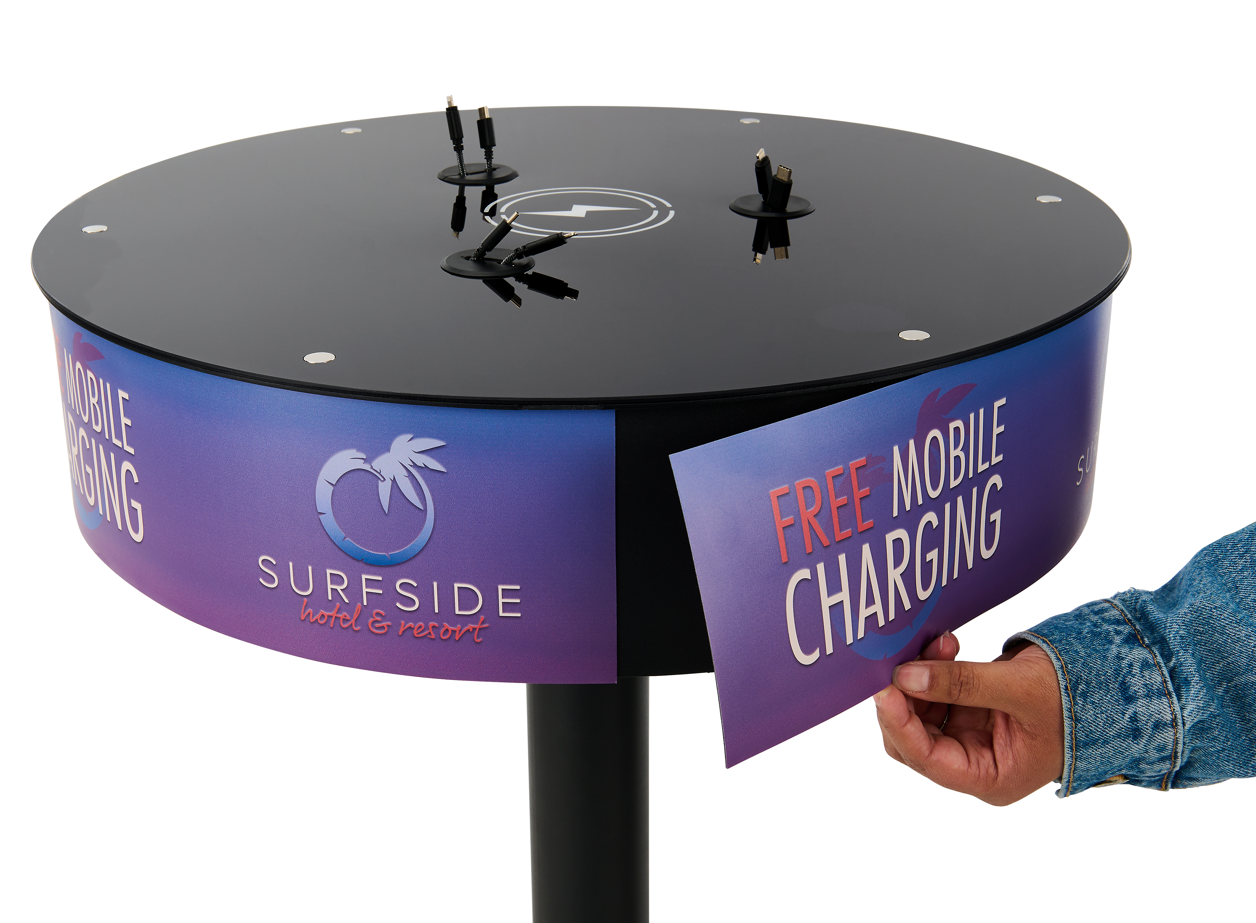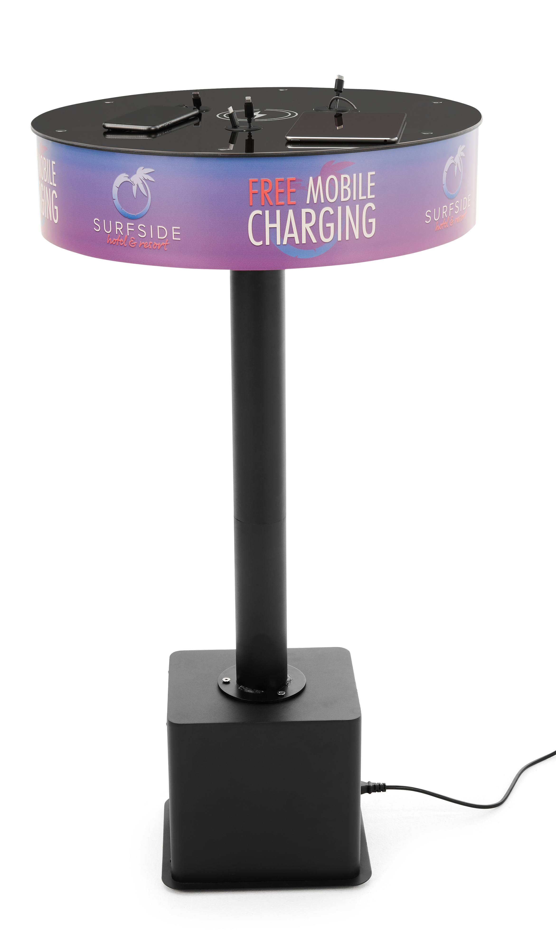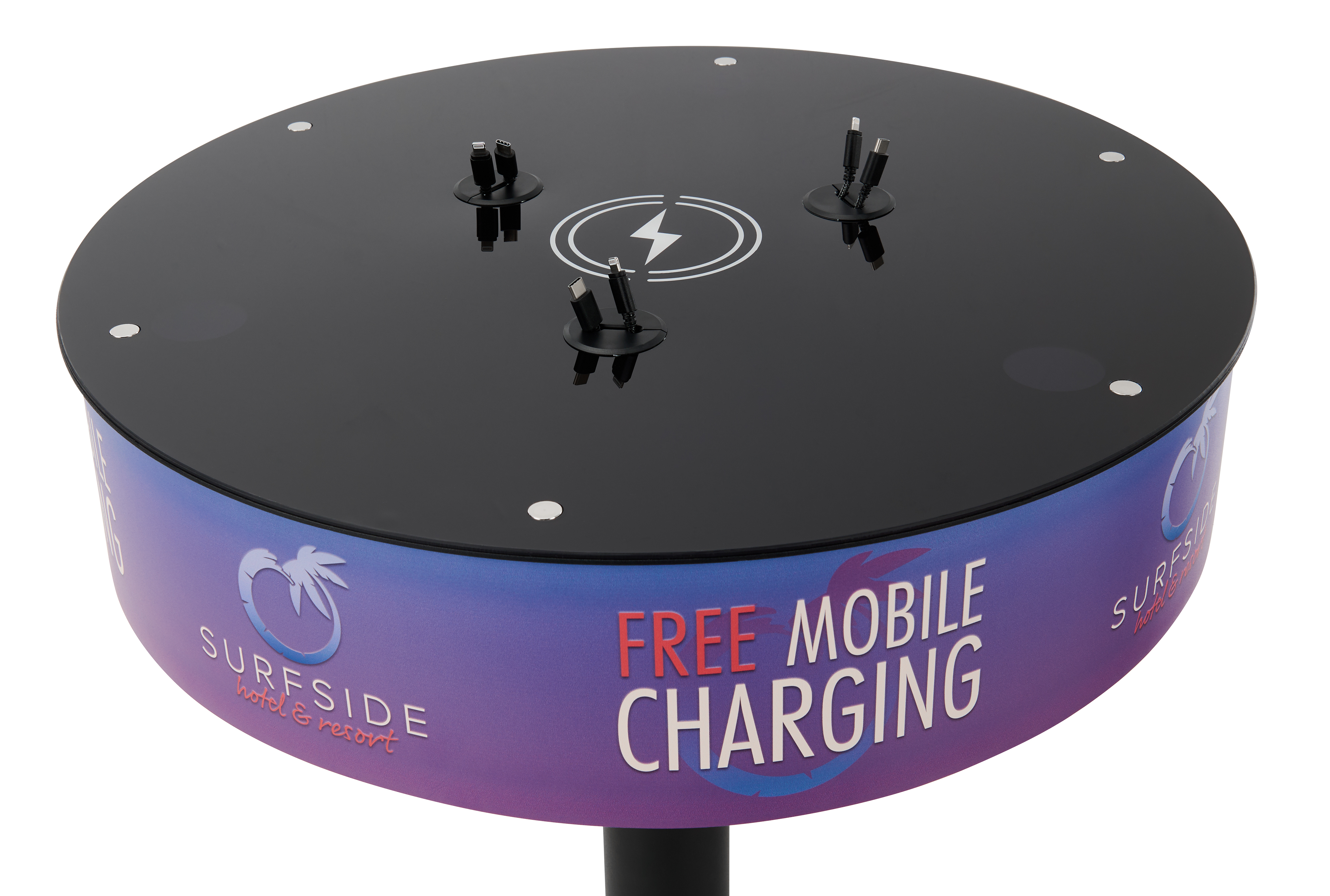 This mobile charging station will attract the attention of event attendees by providing them with a free charging solution and public congregation area. Made of durable steel and a 23″ round clear acrylic counter, this unit can withstand high-traffic environments and act as a workstation. A maximum charging capacity of 7 devices allows a group to network while they power up their phones, laptops, tablets, and more. This kiosk can be conveniently powered with the included power cord, a 12V/55AH gel battery, or a rechargeable lithium-ion battery (batteries not included – maximum battery dimensions 9.1″H x 5.4″W x 9.1″D). Any device can utilize this mobile charging station with three 8-pin charging cables compatible with Apple devices, three USB-C cables, and a wireless charging pad. Showcase your endless creativity by creating immersive full-color graphics that affix magnetically to the unit. These graphics wrap around the center giving your design a panoramic view. Quickly maneuver the unit from one location to another by tilting on its side and rolling it along 2 wheels. Whether located in a hotel lobby, trade show, marketing event, or sporting arena, our mobile charging station will elevate the atmosphere by advertising your company while keeping your guests charged and connected to both each other and their devices.