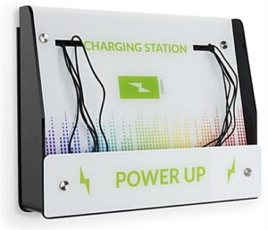 Provide the convenience of all day power to customers or passersby with this wall mount mobile charging kiosk. A 3.5” deep pocket allows devices of any size to fit such as iPads, tablets, and smartphones. Each customizable mobile charging kiosk can be outfitted with a logo or graphic of your choosing using our UV printer. The personalized phone powering station visuals can be switched out by simply unscrewing the standoffs and replacing the panel. Tablet and iPad units like this are useful in waiting rooms, hotels, airports, and events of all sizes. Build a personalized phone power area using this charging kiosk to provide an essential convenience to patrons.
