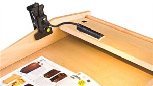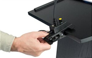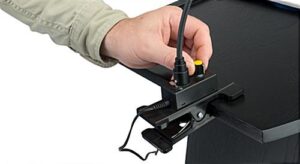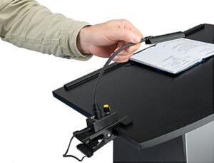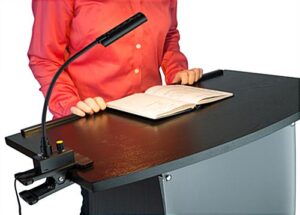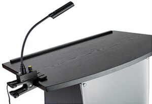 This podium light illuminates an orator’s notes. This podium light, such as a lectern lamp, has a flexible gooseneck so it can be easily adjusted to just the right angle for a presenter. This LED lamp, a podium light is sold with a clip-on base that will attach to most podiums. A podium light that is attached by a clip is convenient because this light is not permanently attached to any lectern. As long as a lectern has an edge that is less than 1-1/2″ thick, this clip will hold the lantern in place effortlessly. If your lectern has an exposed edge on the top of the pulpit, side, or a reading surface shelf, any area with a 1-1/2″ thick exposed edge will do. This podium light, a lectern lamp or a presentation lighting accessory, can flex in any direction.